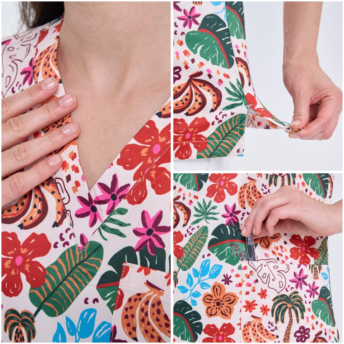 Premium Breathable Fabric: Crafted with precision-engineered 95%polyester/ 5%spandex blend.Four-Way Stretch for unrestricted movement;Moisture-Wicking Technology keeps skin dry during long shifts;Reinforced seams and stitching create an ultra-durable nursing garment.
