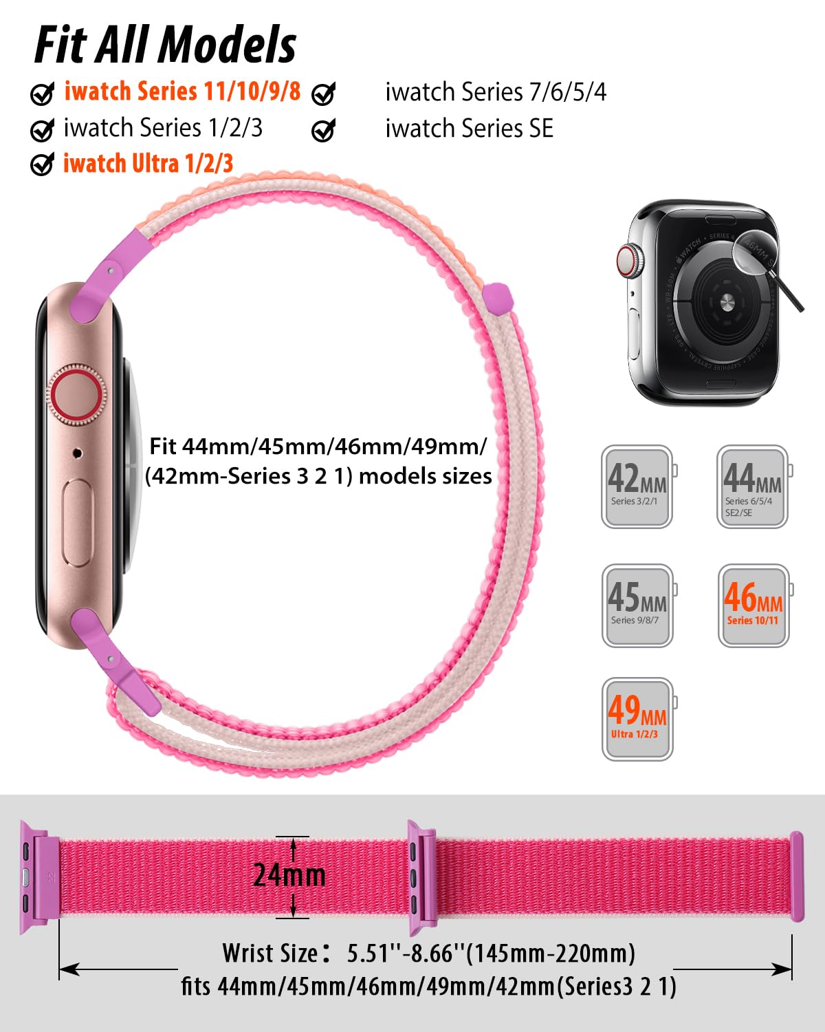 [Fit All Models]: Sunnywoo sports nylon watch bands - Compatible with apple watch for women and men, Fits all apple watches, iWatch Bands for Se, Ultra 3/2/1, Series 11, Series 10, Series 9, Series 8, Series 7, Series 6, Series 5, Series 4, Series 3, Series 2, Series 1, iWatch wrist straps offer two size options, ① 5.11"–7.87" (130–200mm) fits 38/40/41/42mm cases ② 5.51"–8.66" (145–220mm) fits 44/45/46/49mm cases. Please check the size on the back of the watch and choose the right size