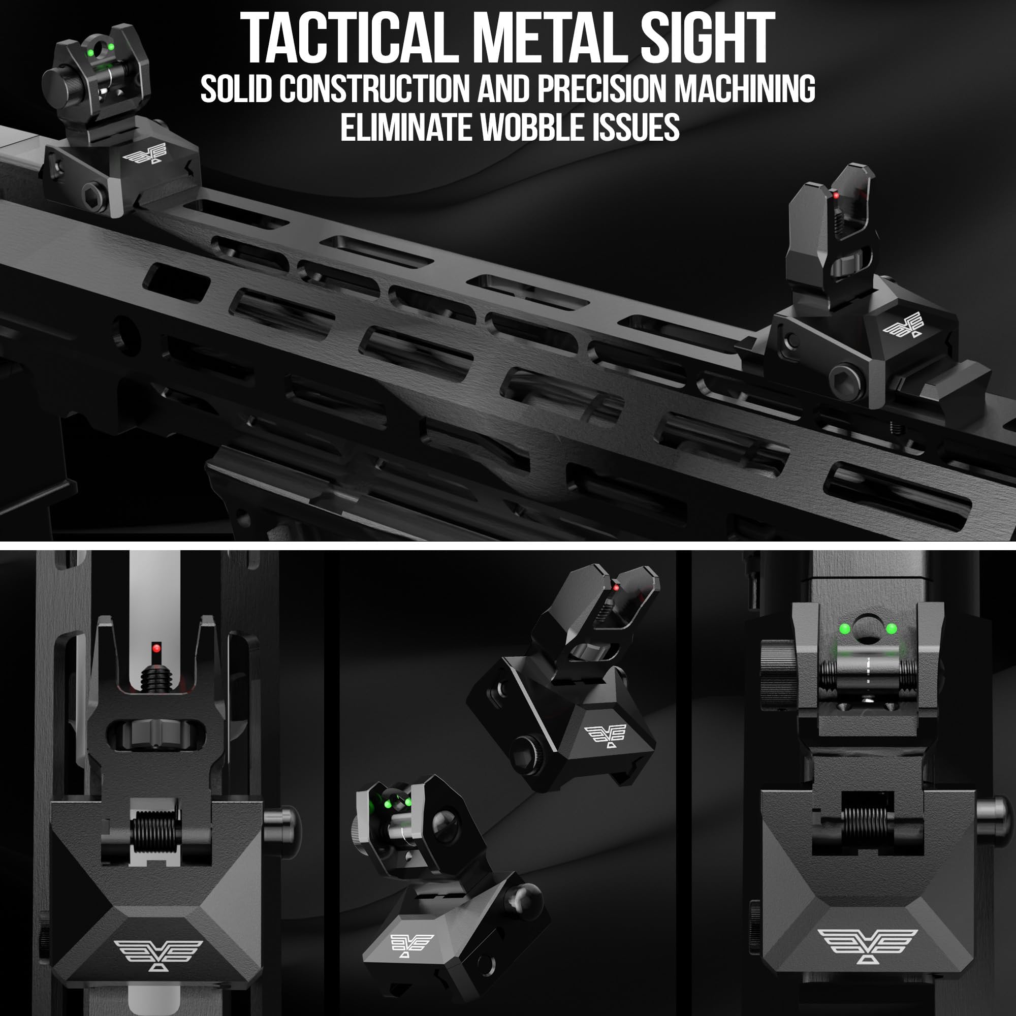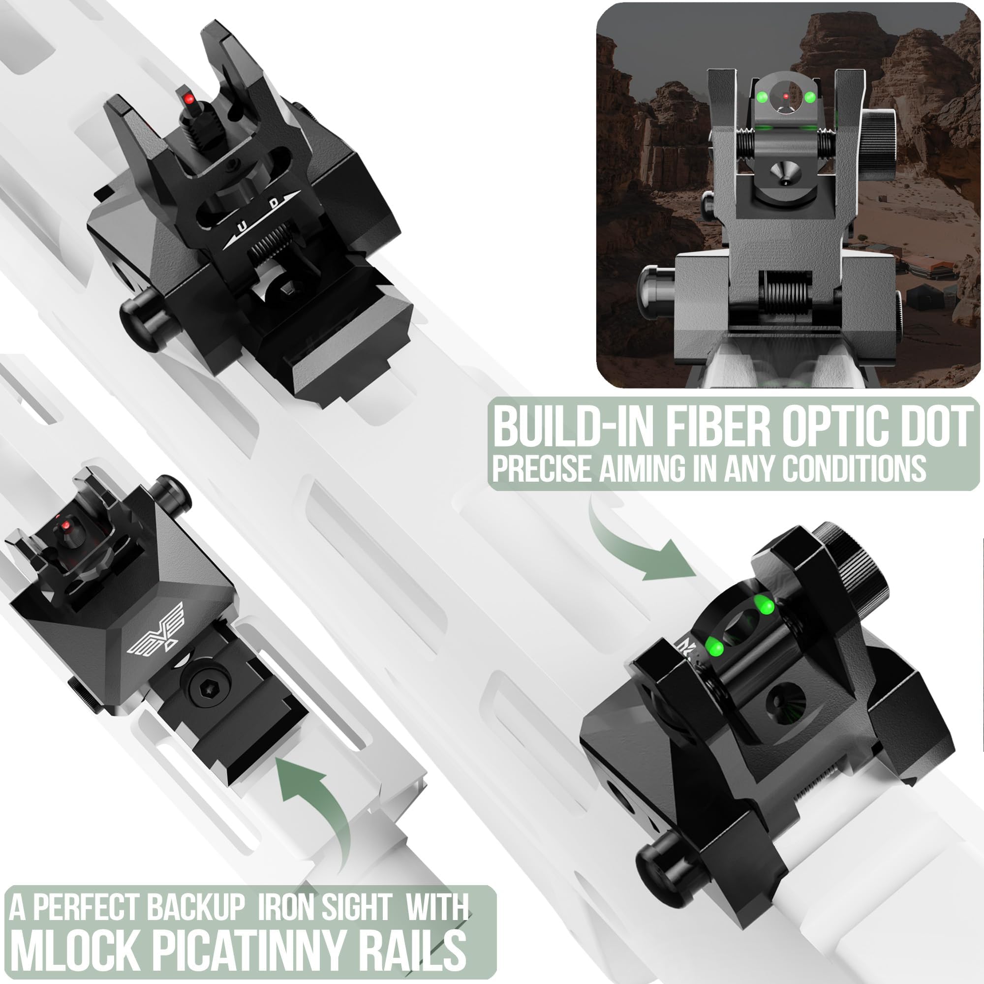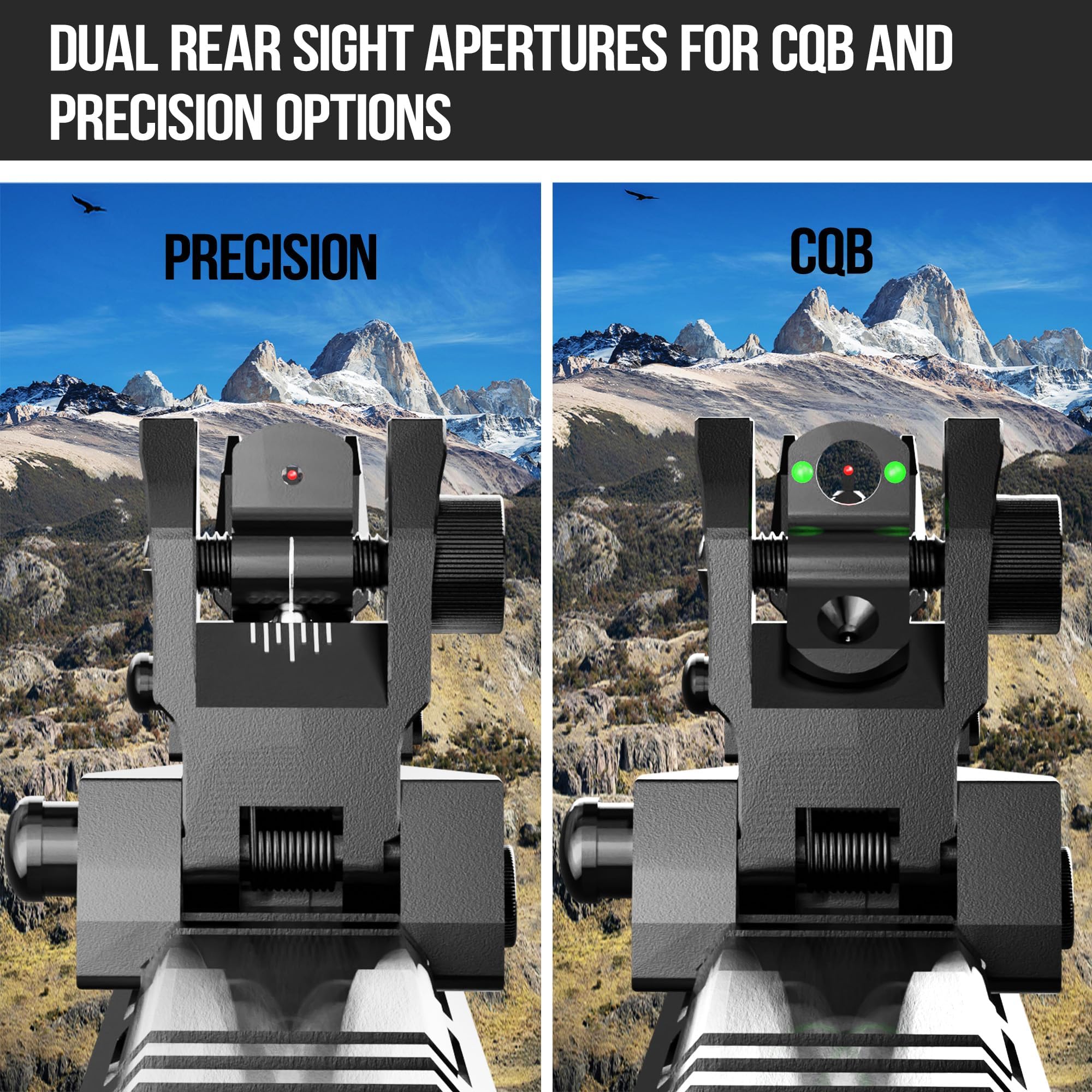 [ Red Green Fiber Optic Highlights ] The backup front and rear iron sights set features high definition fiber optic technology for precise alignment in any lighting condition.It come equiped with red and green dots and dual aperture design for quick switching between CQB and precision shooting. Fully adjustable for windage and elevation without any tools.