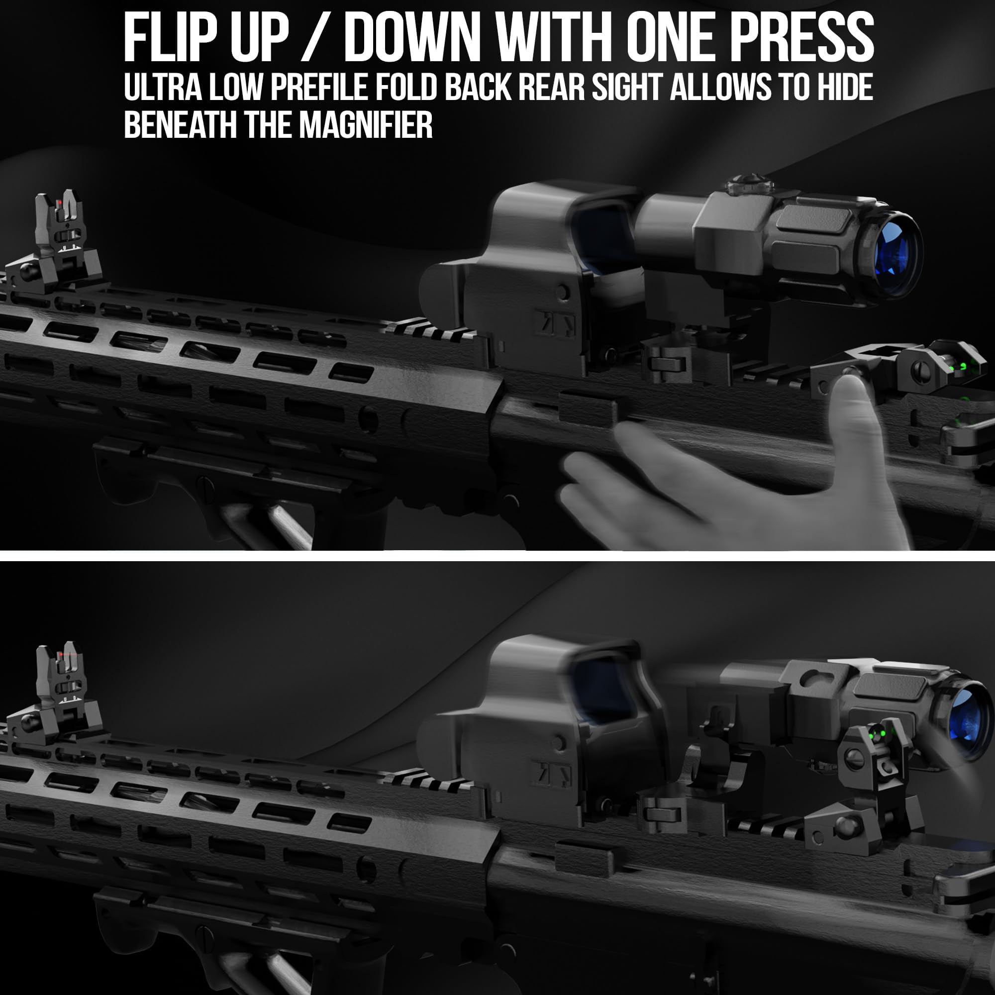 [ New Version Flip Up Iron Sights ] The flip-up iron sights takes up minimal space,allowing you to clearly see your sight picture through them and enable faster alignment, accuracy is improved during fast-paced shooting.The low profile flip-up iron sights extend only 2 inches above the rail without taking up interfering with optics