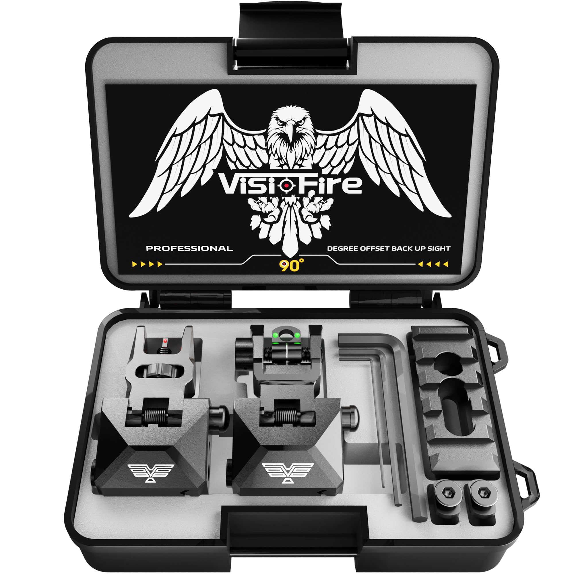 The Visofire flip up fiber optic iron sights are made of extremely durable aluminum. The fiber optics red and green dots provide more enhance and visibility, allow for smooth transitions between different shooting setups and it's perfect for tactical situations or hunting with Picatinny or Weaver rails