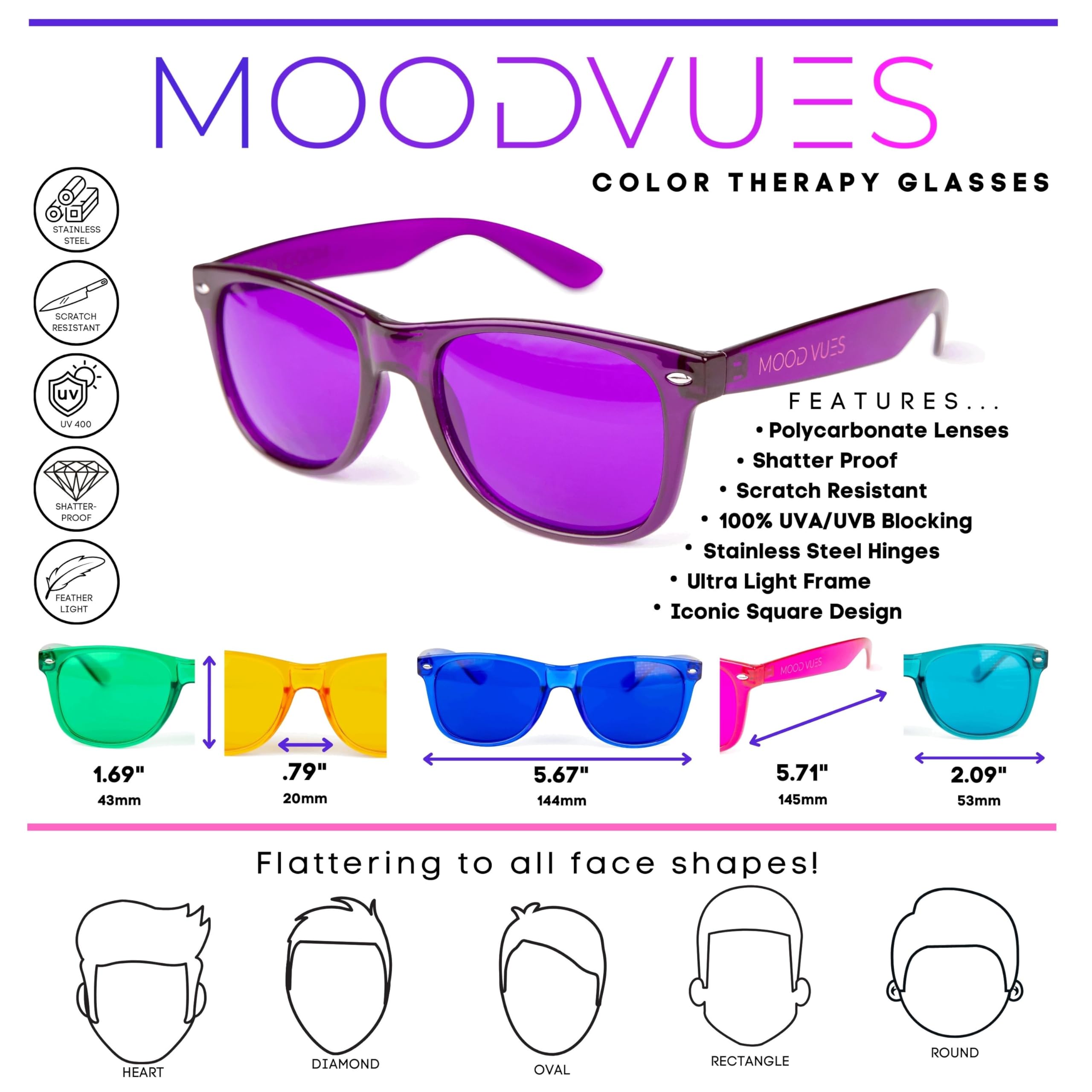 Forever in Vogue and Made to Last: These classic square chromotherapy light glasses will never go out of style. Plus, our UV-blocking color lens glasses are scratch-resistant, built sturdy, and include a matching soft felt-lined pouch for safekeeping.