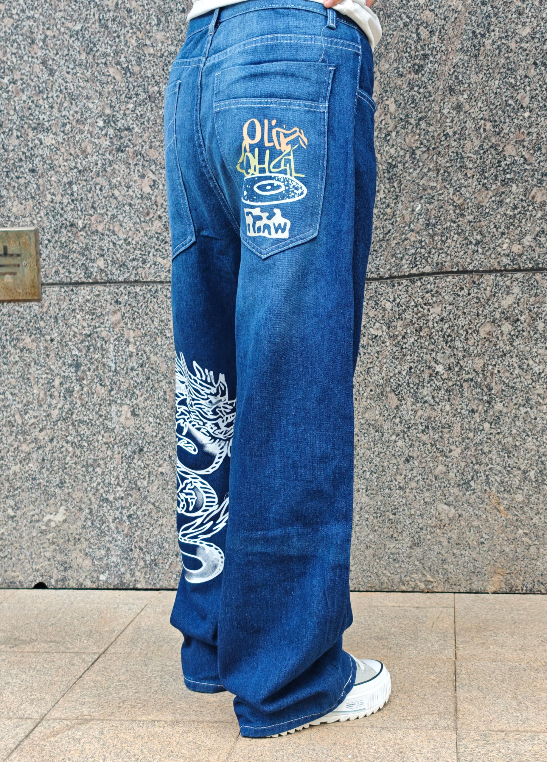 The dragon print and letter graphics on these vintage-inspired, trendy jeans make a bold statement.