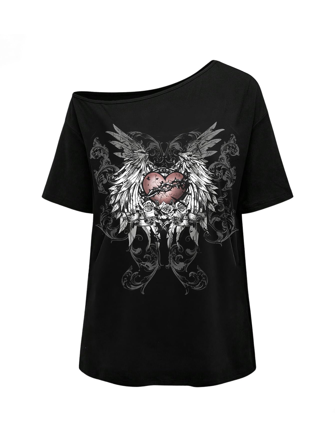 Features: graphic print, halfsleeve, boat neck, drop shoulder, goth tee shirts, y2k trendy tee tops