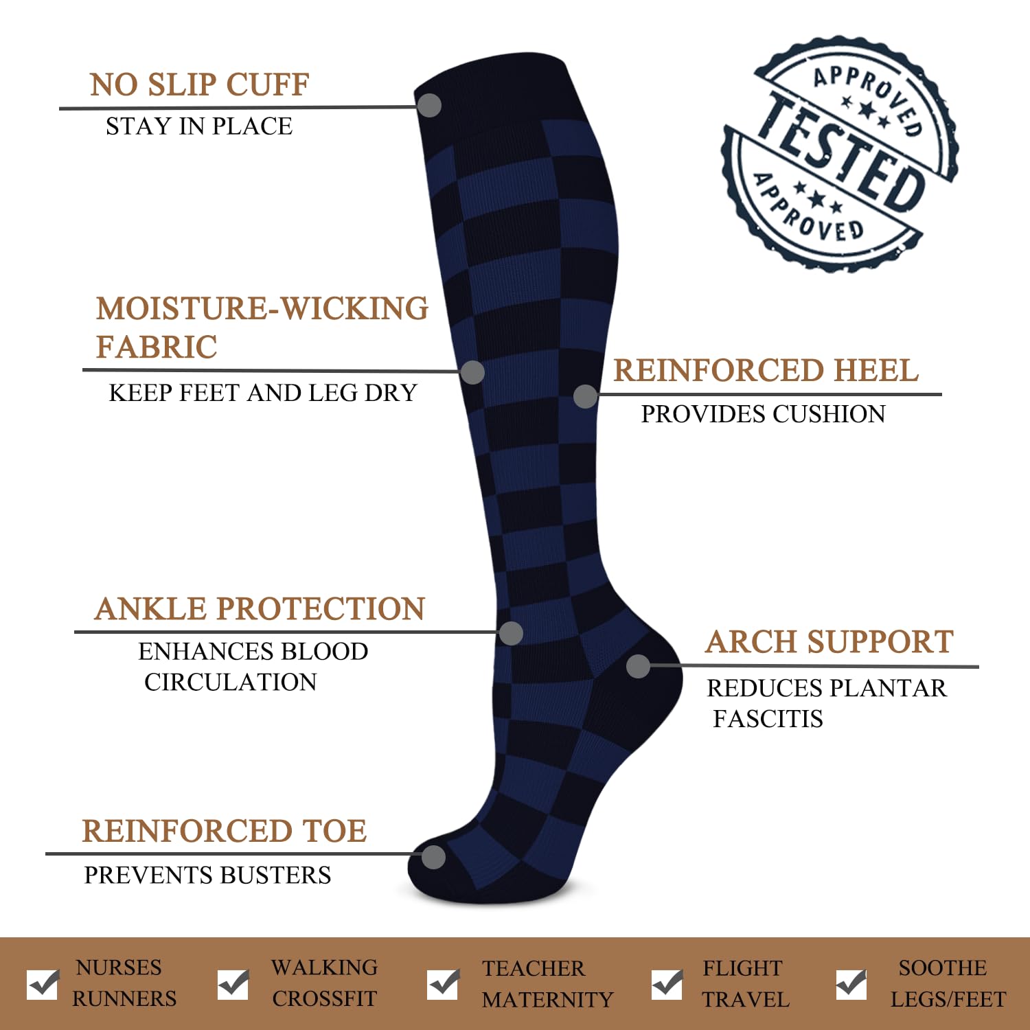 Knee-high design with a secure calf fit offers consistent coverage and support, making these compression stockings suitable for nurses, office staff, travelers, and people who spend long hours on their feet or moving throughout the day.