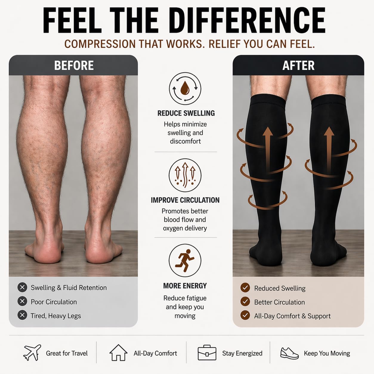 Unisex style designed for both women’s compression socks and men’s compression socks, featuring a clean and practical look that pairs easily with work, casual, or travel outfits for everyday use.