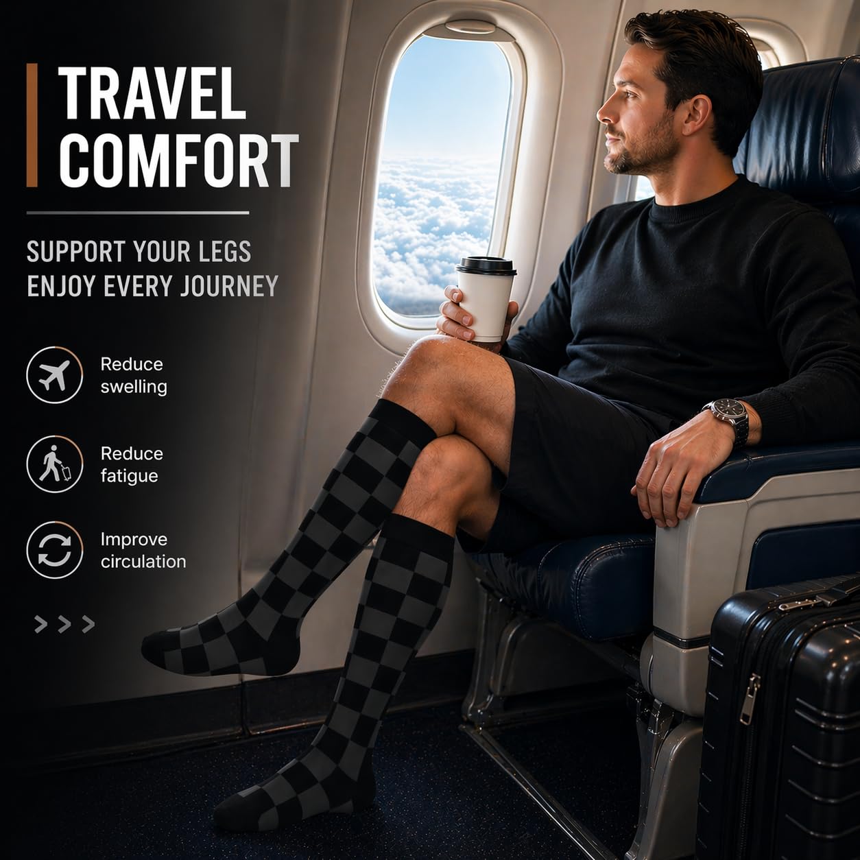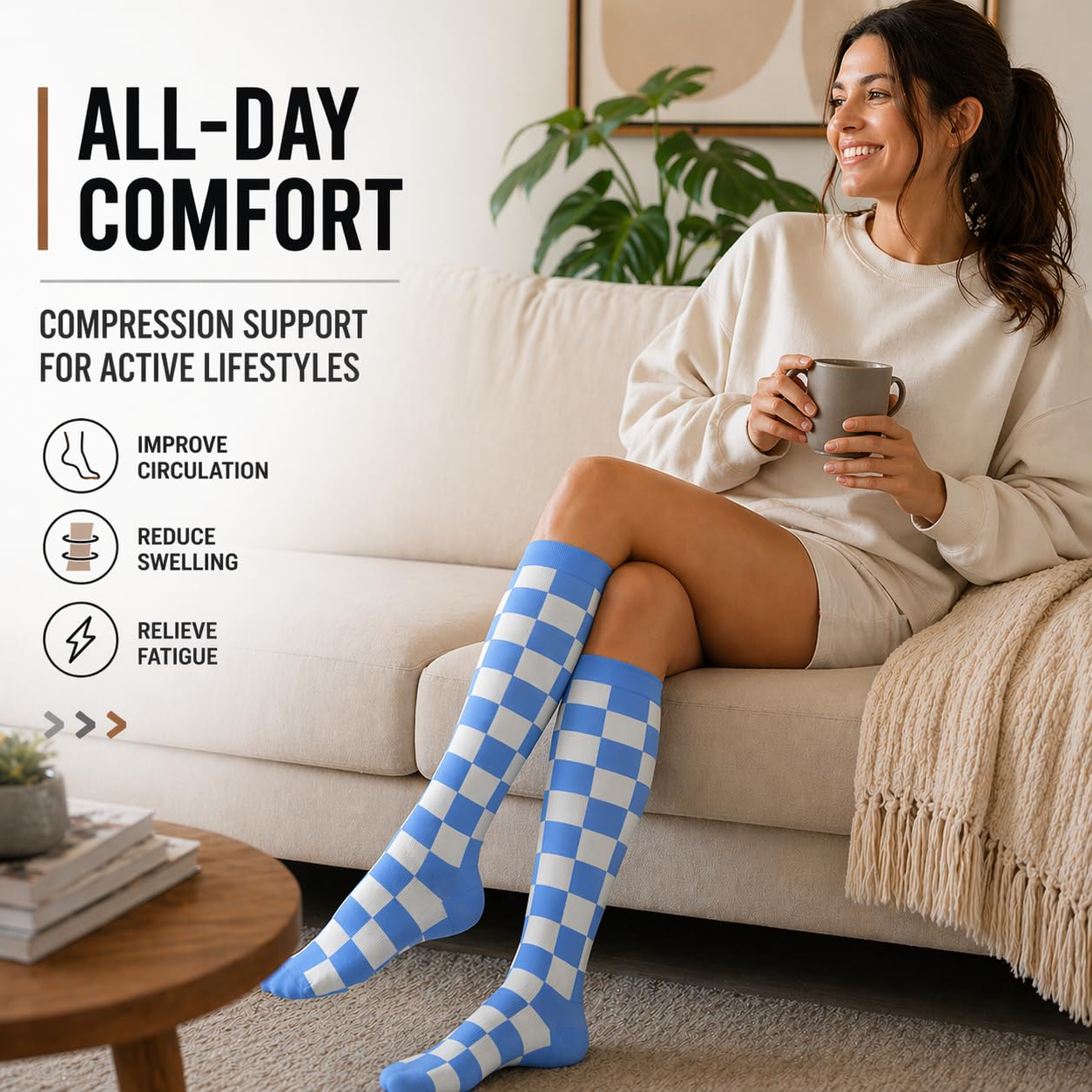 Designed as everyday compression socks with 15–20 mmHg support, offering a balanced compression level that feels supportive without being overly tight, suitable for daily wear, travel, and long periods of standing.