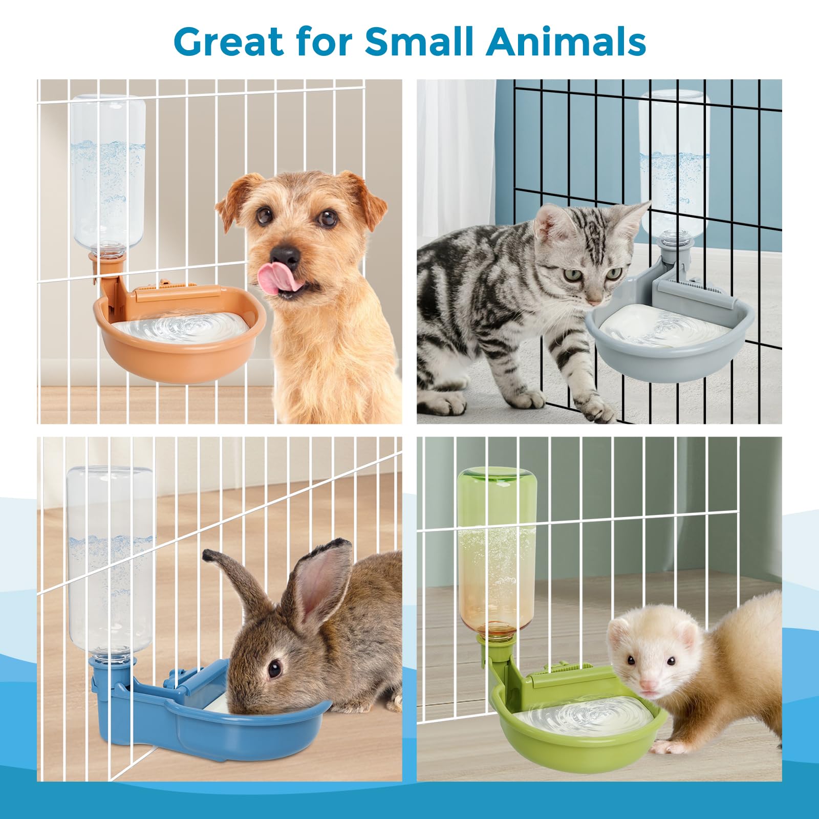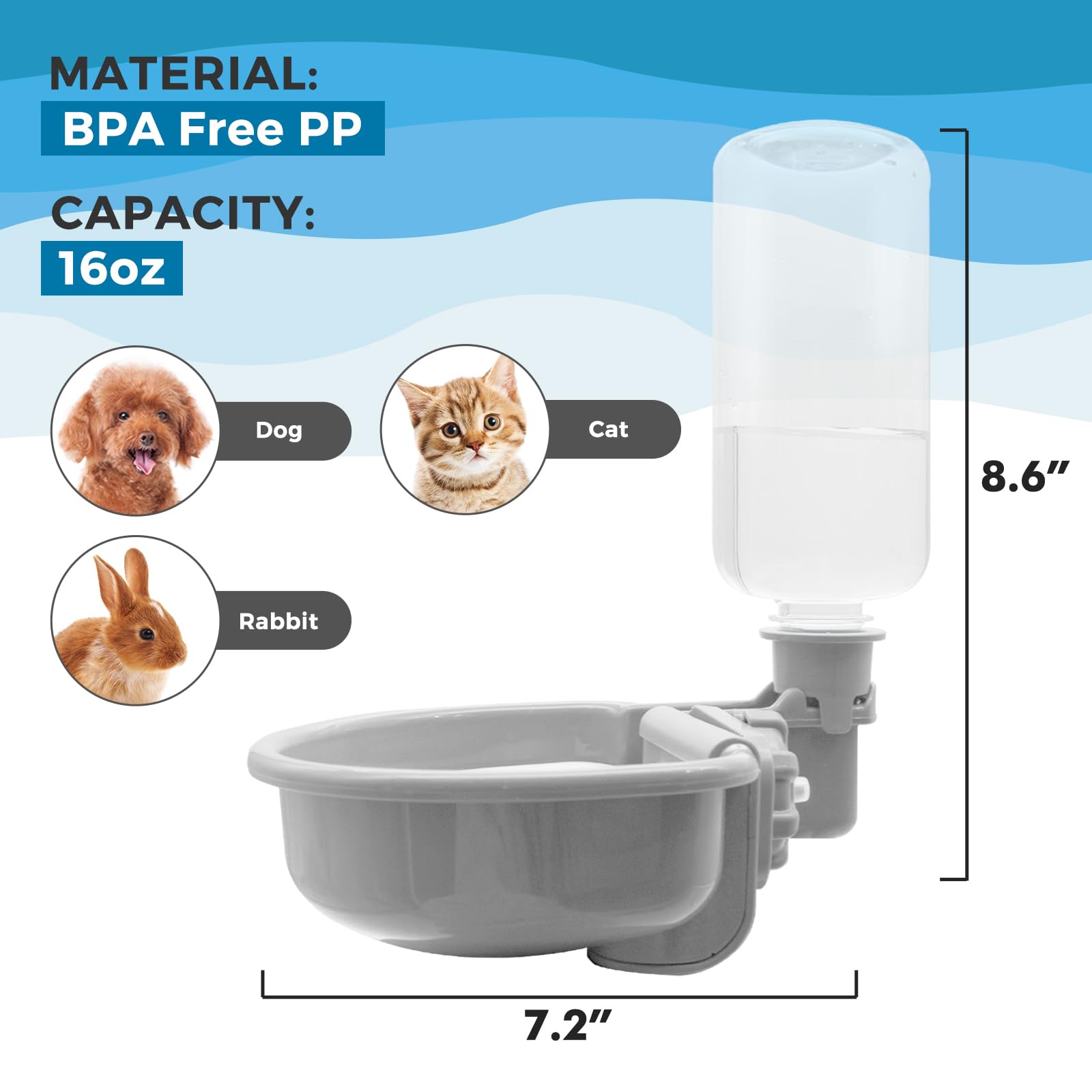 【Great for small animals】: This 16oz/480ml water bottle for cage is sized for small dogs, cats, rabbits and other small animals.The capacity is enough to provide your pet with daily water needs. The water comes out automatically under the force of gravity.