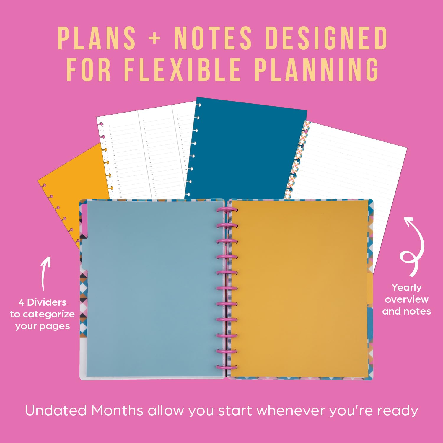 HAPPY PLANNER UNDATED PLANNER: Our Homespun-themed Plans + Notes 12-month notebook planner has undated calendar pages, yearly overview pages, and 68 front-and-back lined note pages. This Big-size planner measures 8 1/2" x 11", includes 95 total pages, and features a plastic cover with a geometric pattern that says “Plans are dreaming in the making.”
