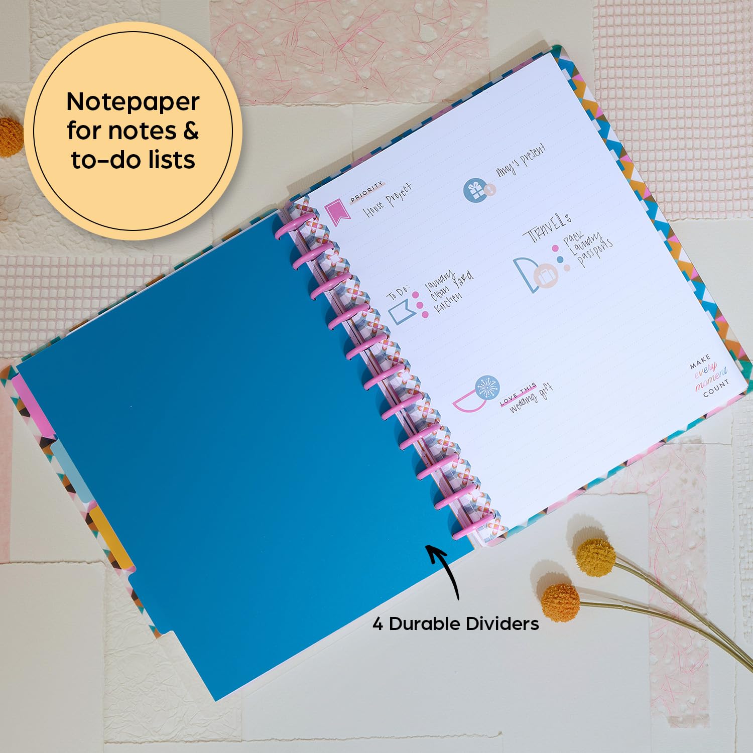 JOURNAL PLANNER: Our focused monthly planner comes with 4 dividers and 6 sticker sheets that help organize and identify your notes while you document all the moments that make your day special. Use them to make sections for daily planner to-do lists, bills, self-care reminders, and more.