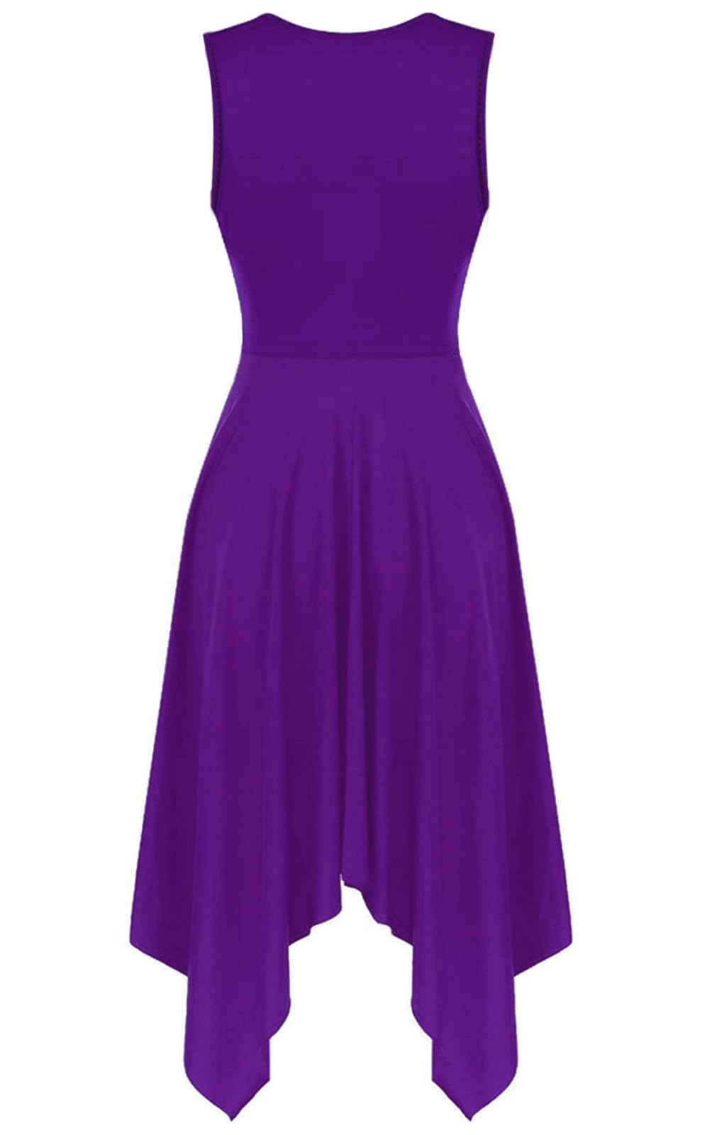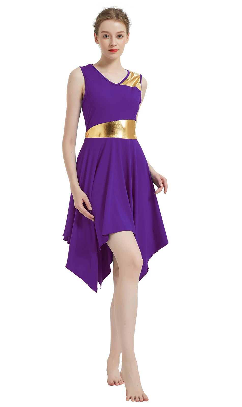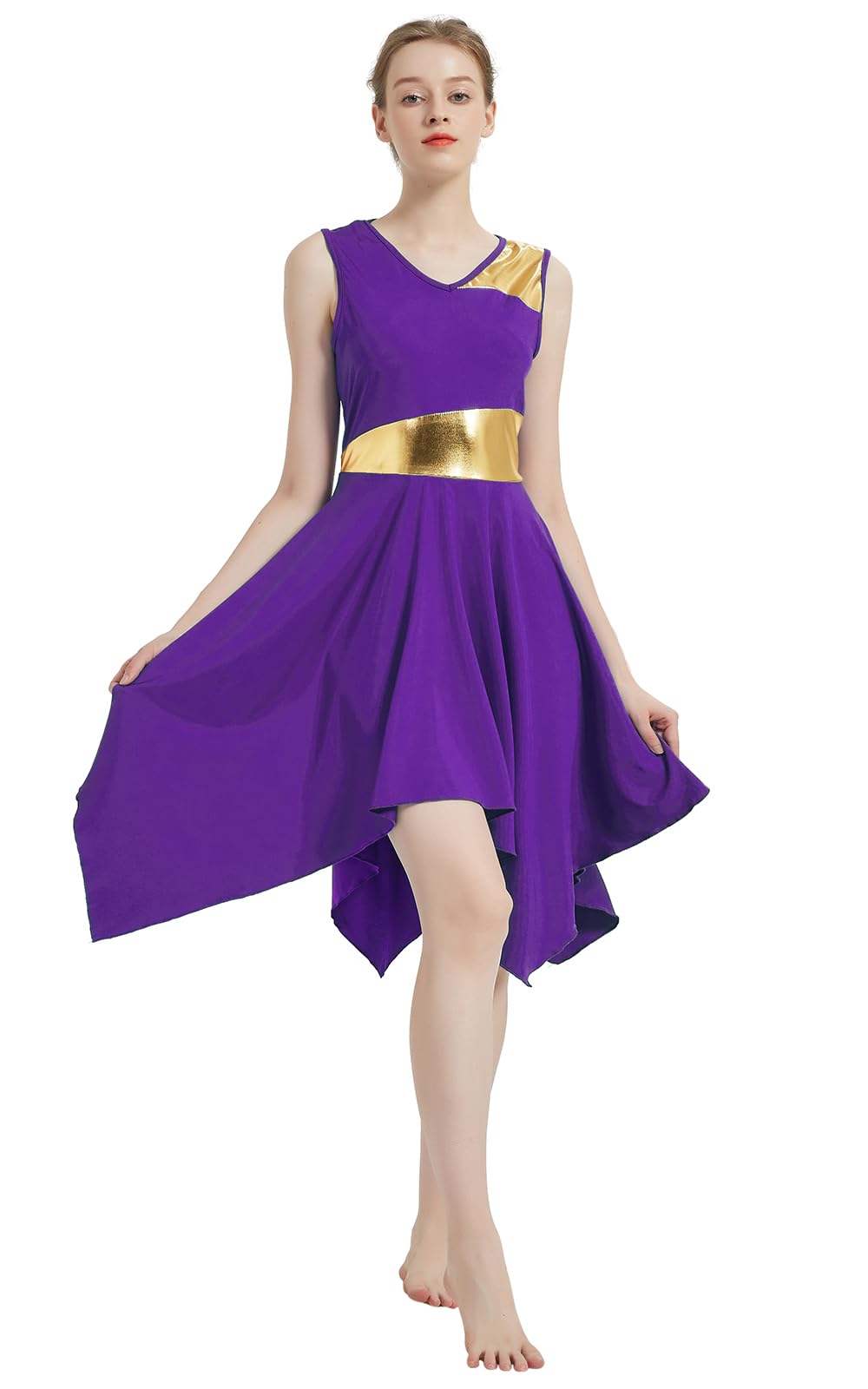 UNIQUE DESIGN: Sleeveless irregular hem praise lyrical dance dress, v neck, pull-on closed, metallic color block patchwork. Metallic fabric surrounds the entire waistline, creating a high waist effect. The bottom is a irregular hem big swing flowy skirt, can be looks flowy and graceful when twirling or moving.