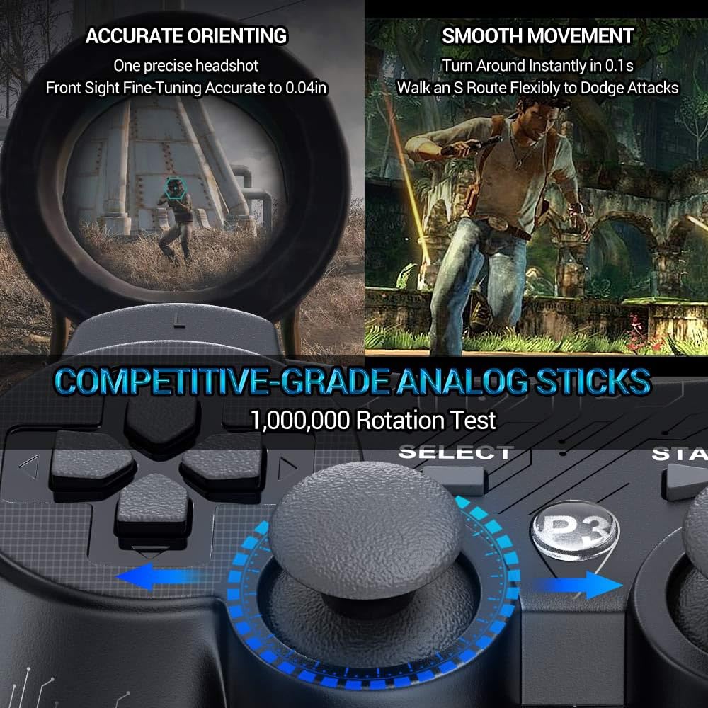 【Sensitive Buttons Passed 10,000,000 Strokes Test】The high-quality controllers 2 pack for PS3 are upgraded to be close to the original. It has a zero-delay quick response. The control for PS3 uses first-class material and is of first-class craftsmanship. It has passed a strict durability test of 10,000,000 times of strokes. The two 360 degree analog joysticks of the controller wireless for PS3 enable you to control the games effortlessly and precisely. No dead zone.