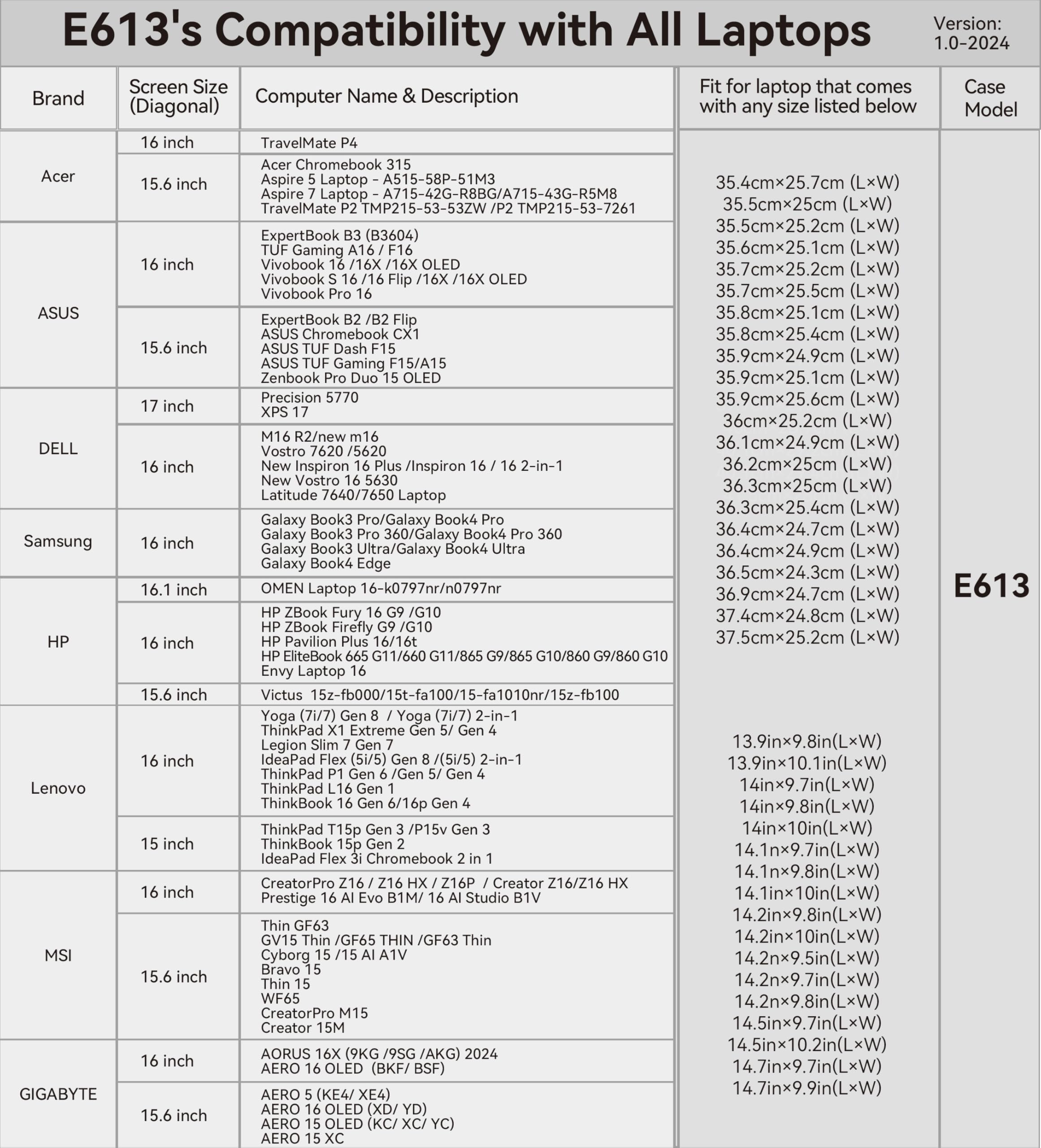 Model No.: E613; internal dimensions of the case: 38.5x26x2 cm (15.16x10.24x0.79 inch)