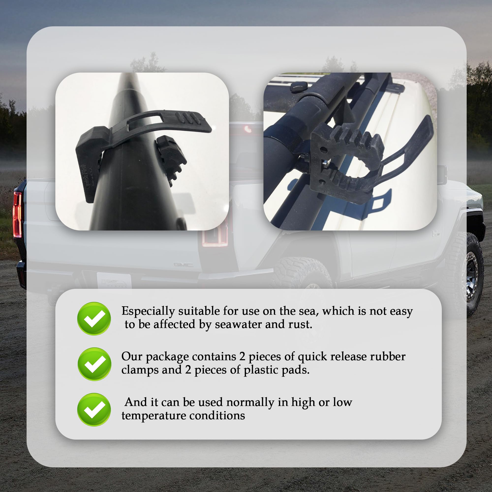 🔩 Package Includes: Our package contains 2 pieces of quick release rubber clamps and 2 pieces of plastic pads. The plastic pads highly match the quick release clamps for a stronger and more stable fixing, our quick release clamp mount kit is a must-have car accessory for your driving life!