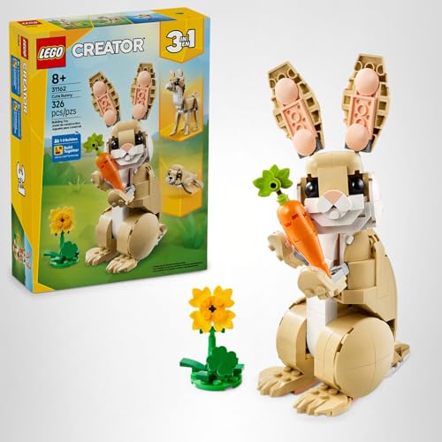 Kids ages 8 and up will love building their own bunny toy with posable head, ears and legs with the LEGO Creator Cute Bunny (31162) toy building set. These 3 in 1 toys for girls and boys let them build 3 different LEGO animal figurines with the same building blocks: a posable cute bunny figure with a sunflower and a carrot, a posable llama toy with a patch of green grass and half a carrot, and a seal figure with a fish and a sheet of ice. Get this kids toy as a gift for little ones who love animals or pretend play. LEGO Creator 3 in 1 sets inspire kids’ imaginations with 3 different building options in every box. Build together with friends and family with the LEGO Builder app, which offers a fun and collaborative experience when building this set. Please note that models cannot be built simultaneously. Contains 326 pieces.