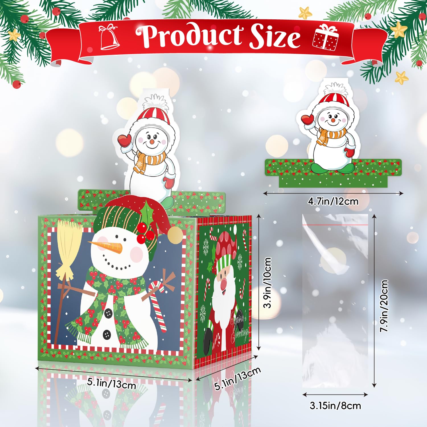 Finished Box Size: 5.1" (L) x 5.1" (W) x 3.9" (H), Plastic Bag Size: 3.1" x 7.8", What’s Included: 1 x Christmas Money Box, 48 x Plastic Bags, 1 x Pull Card, Material: Thick Cardboard Box, Plastic Clear Bags
