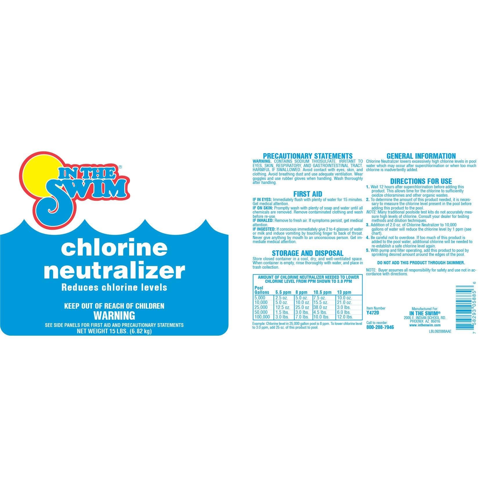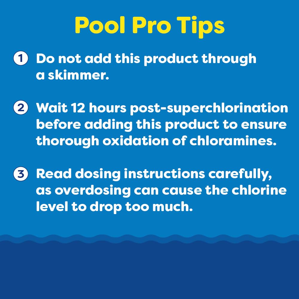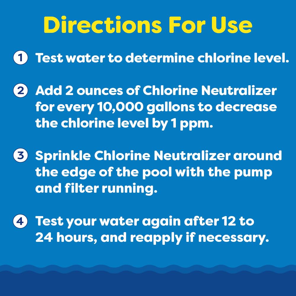 Dosage: 5 ounces per 10,000 gallons of water to lower chlorine levels 5.5 ppm