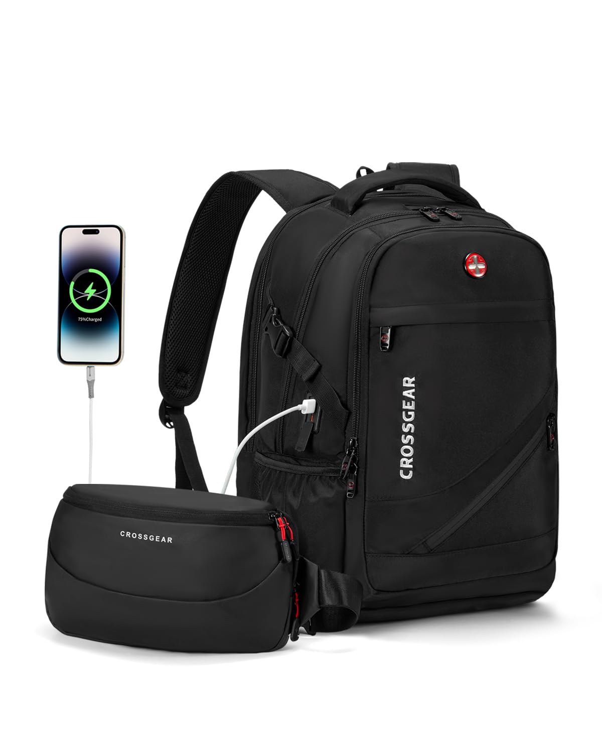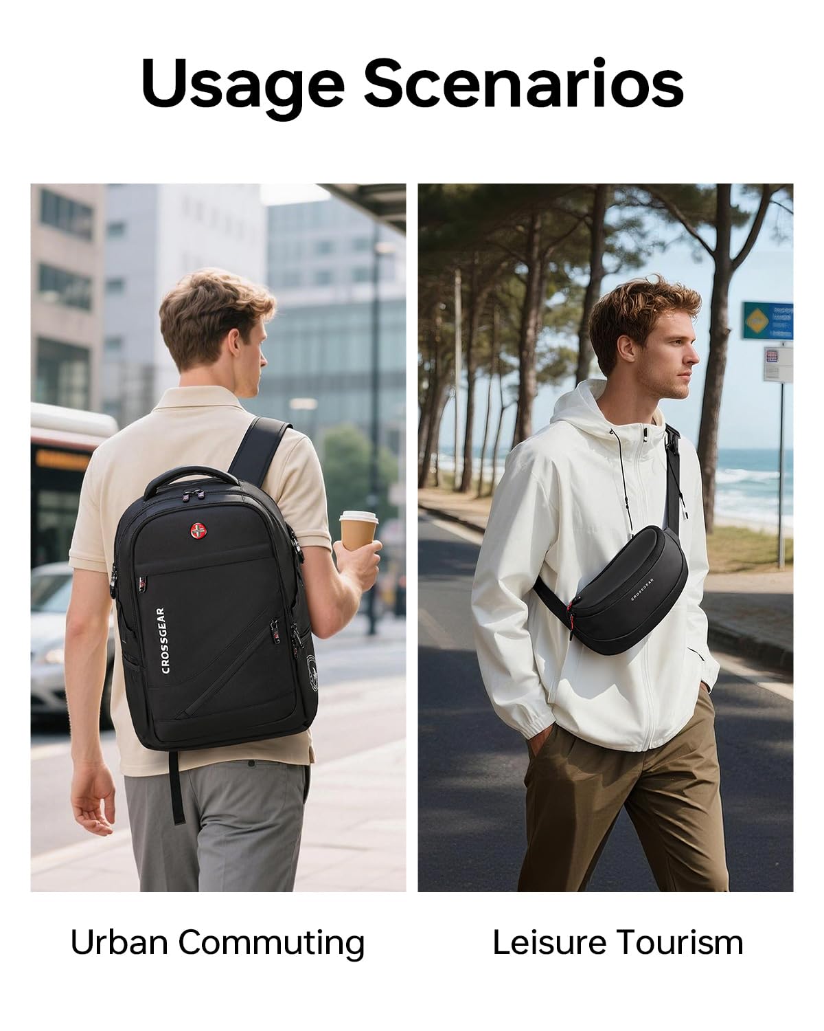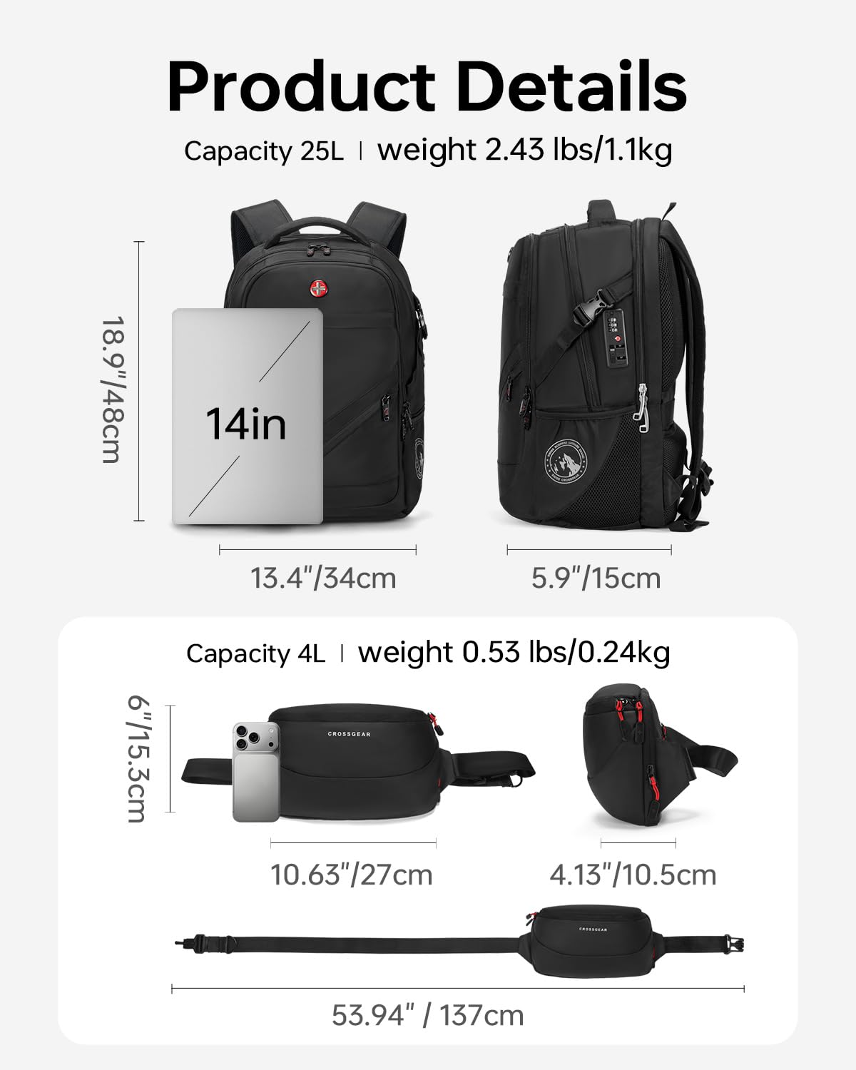【Laptop Backpack with Crossbody Sling Bag Set】This 25L large-capacity travel backpack features 3 compartments & 10 pockets. The padded laptop sleeve securely fits 14-17.3 inch computer. It organizes clothes, tech, and daily essentials. 4L sling bag holds a 7.9-inch tablet, phone, passport. Perfect for college, work or business travel.