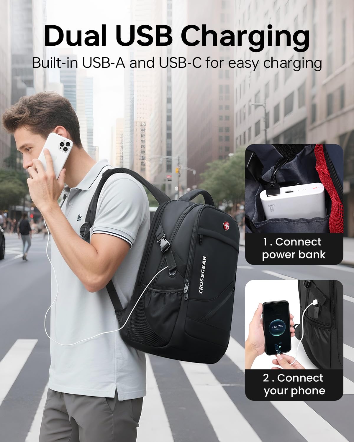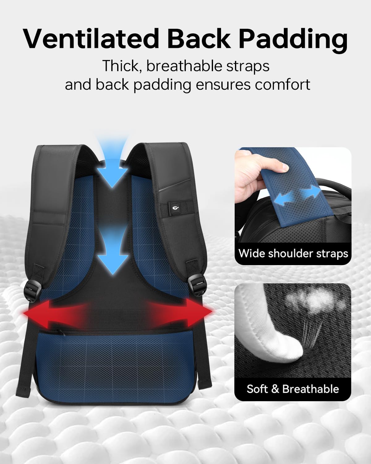 【Breathable & Travel-Friendly Design】Stay cool with the U-shape airflow back panel and wide mesh straps. A built-in side charging port offers on-the-go power. The rear trolley sleeve slides over luggage handles, making airport transfers effortless for men and women on the go.