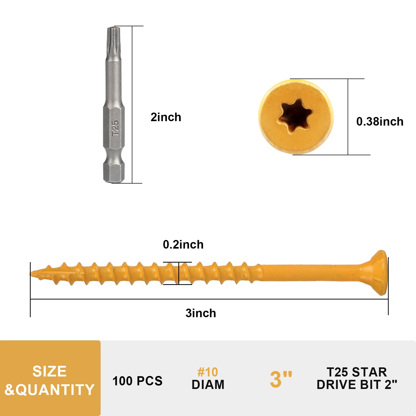 Product Packaging: #10×3 inch high-quality carbon steel deck screws, 100 pieces, With T-25 star drive drill bit. Fmjdnls Deck Screws are arranged in a beautiful container box for convenient storage, Easy identification