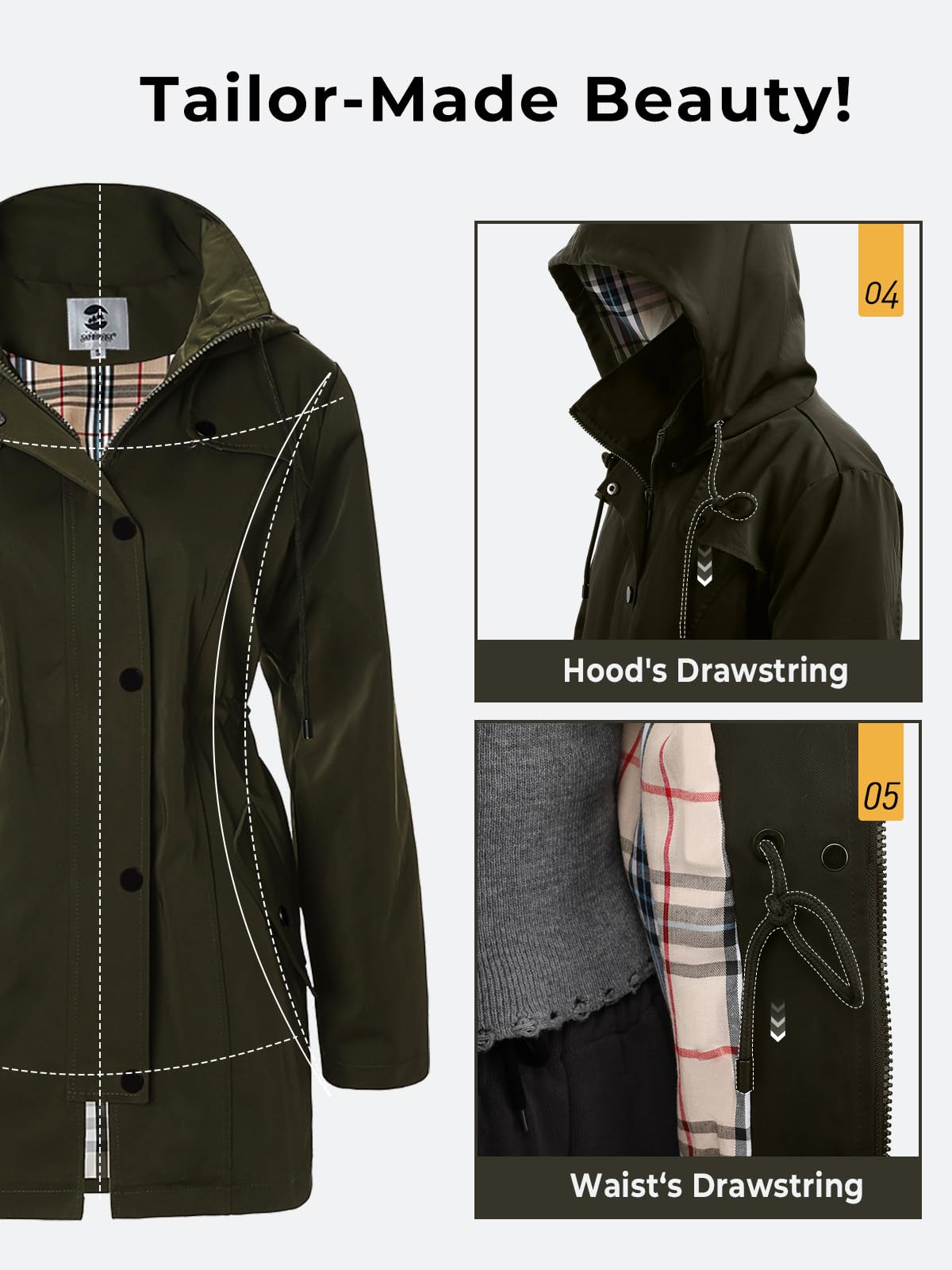 【Material】: This rain jacket made of 100% polyester shell which is water-resistant, suits for traveling or walking in light rain. Soft lining make sure comfortable enough to wear.