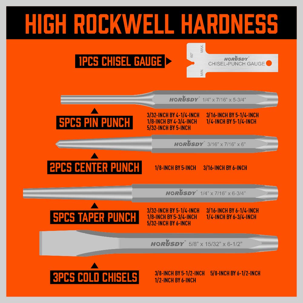 5PC Tapered punch: 3/32" x 5-1/4", 1/8" x 5-3/4", 5/32" x 6", 3/16" x 6-1/4", 1 /4" x 6-3/4" and 3PC Cold Chisels: 3/8" x 5-1/2", 1/2" x 6", 5/8" x 6-1/2"