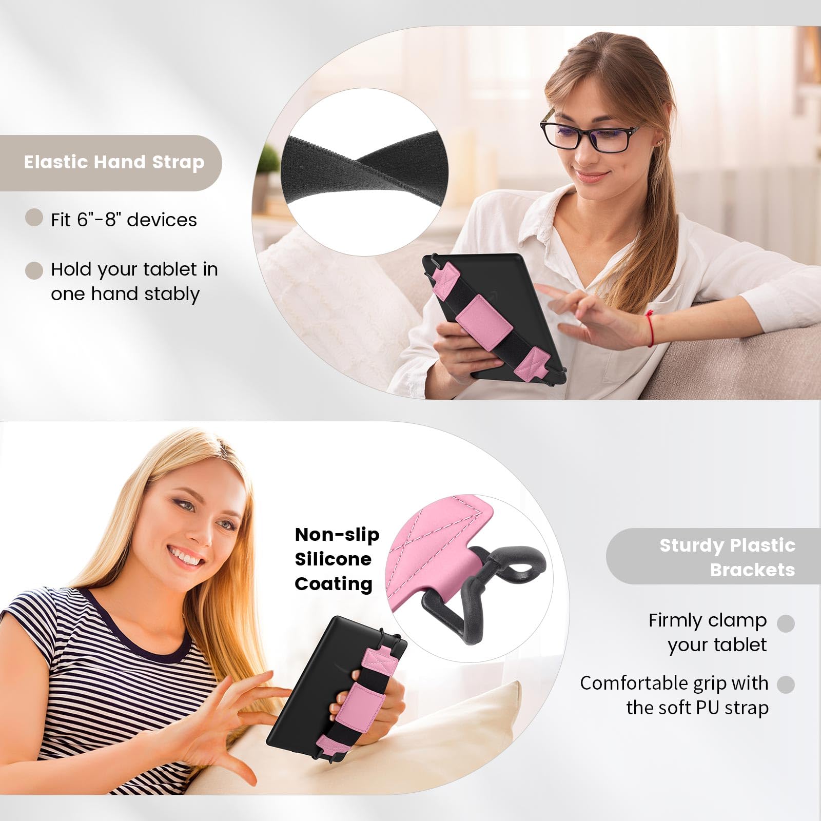 Compatibility: Universal hand strap holder with high durability and elasticity to fit 6 - 8" E-Reader and tablet, including Fire Tablet/Kindle/Kobo Nia/Kobo Clara HD/Lenovo tab M7/tab M8/Voyaga/Sony/Tolino tablet, etc. (Note: Please measure your e-book readers or tablets before purchase.)