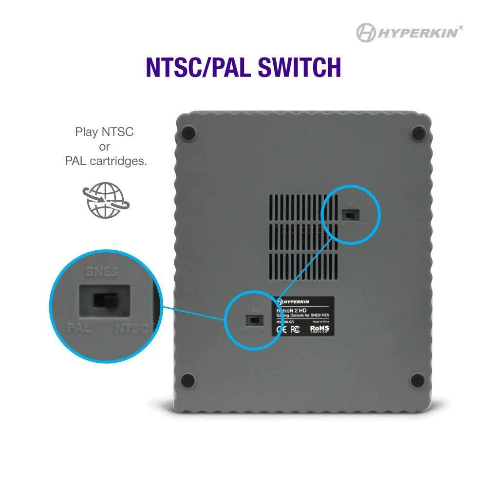 Have tons of old school fun on your HDTV with the RetroN 2 HD! This two-in-one console is compatible with NES, Super NES, and Super Famicom (NTSC/PAL) cartridges, in stunning 720p HD. It includes a “Cadet” and a “Scout” premium classic-style controller; a 3 ft. HD cable; and a 6 ft. Micro charge cable. Change between 4:3 and 16:9 aspect ratio via the RetroN 2 HD’s aspect ratio switch (HD cable only). You can even play via AV with the provided AV cable. Its controller ports support two compatible controllers for each console. This product is not Designed, manufactured, sponsored, endorsed, or Licensed by Nintendo of America Inc in the United States and/or other countries.