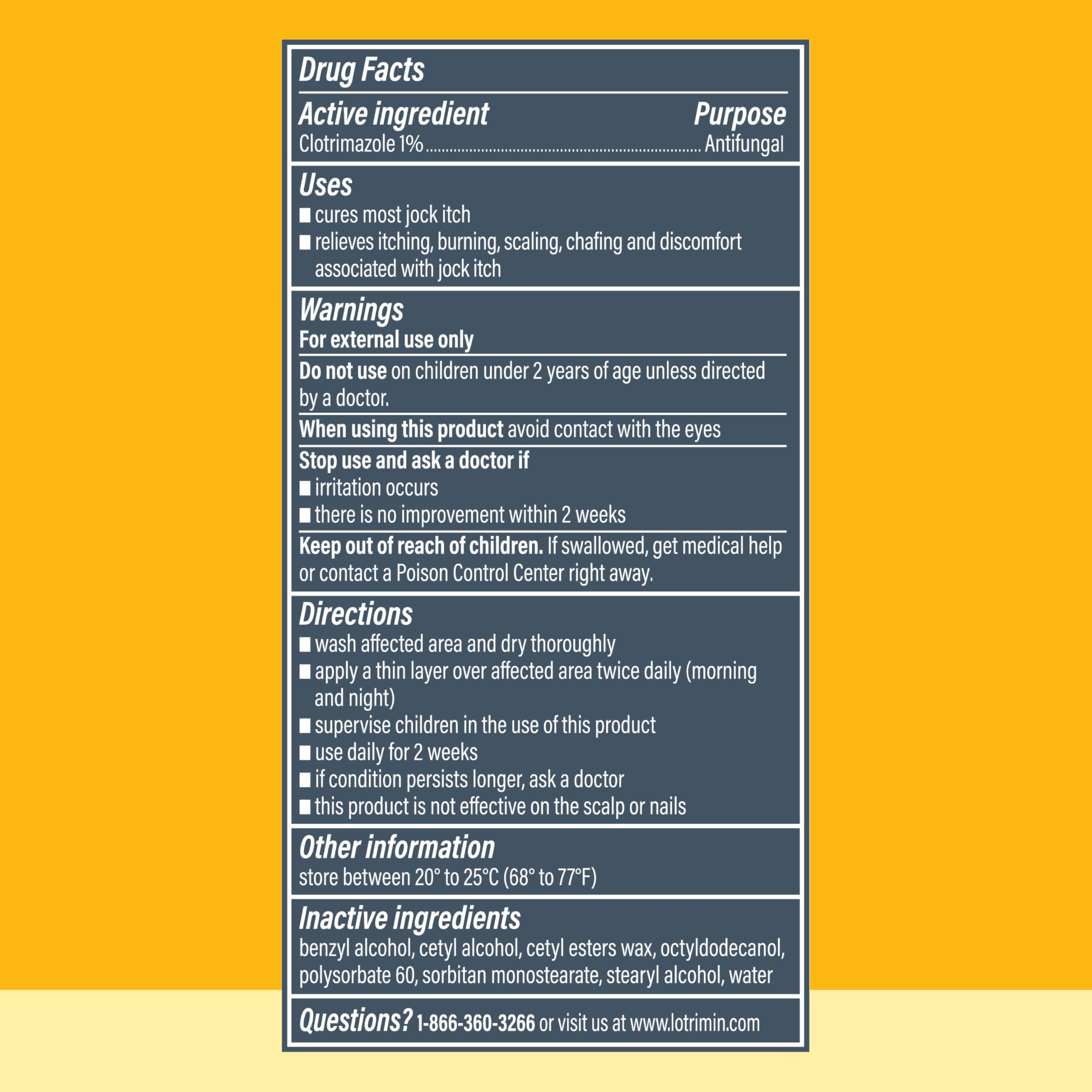 Get relief from the jock itch symptoms of itching, burning, cracking, and scaling skin with Lotrimin AF Jock Itch Antifungal Cream. The active ingredient in this jock itch treatment is clotrimazole, which helps to relieve the discomfort of jock itch symptoms and is clinically proven to cure most jock itch infections. Relieve itchy, cracked skin on your inner thighs and groin with this odorless, greaseless, and non-staining formula that’s easy to apply topically to affected skin. Fight fungus with the power of Lotrimin AF Jock Itch Antifungal Cream – your tinea cruris is no match for this antifungal cream that works to control jock itch. Safe for kids over age 2. Covered by the Bayer HealthCare LLC – Consumer Health 60-Day Satisfaction Guarantee.