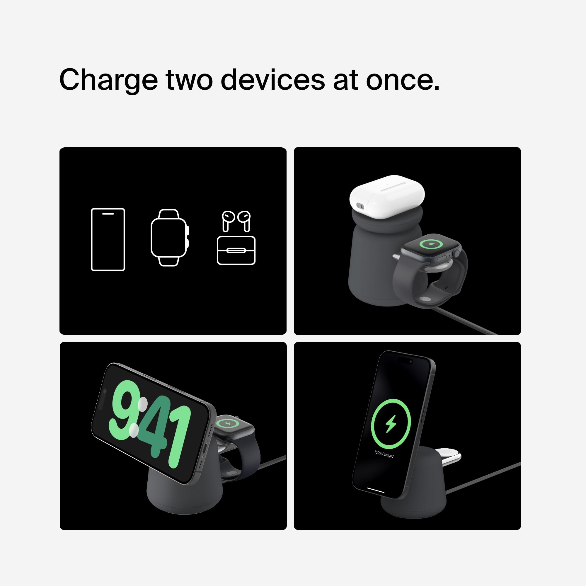 Powering up your devices is as convenient as ever with the Belkin Qi2 2-in-1 Wireless Charging Dock. This ultra-convenient charging dock delivers 15W of fast wireless charging to your iPhone 12 and later, Apple Watch 4 and later, and many models of AirPods. Leveraging Qi2 technology, you can place your iPhone or compatible earbuds on the charging pad for a secure, aligned connection. Plus, it’s StandBy ready for you to take advantage of various iPhone placement options. Belkin is an established accessories market leader creating high-quality, innovative tech solutions for 40 years. Designed for Qi2 Compatible devices only. To be used with MagSafe-approved cases of up to 3 mm in thickness. Viewing angle can be adjusted from 0° (flat) to 70° (vertical). Compatibility: iPhone 12, iPhone 12 mini, iPhone 12 Pro, iPhone 12 Pro Max, iPhone 13, iPhone 13 mini, iPhone 13 Pro, iPhone 13 Pro Max, iPhone 13 Series, iPhone 14, iPhone 14 Pro, iPhone 14 Plus, iPhone 14 Pro Max, iPhone 15, iPhone 15 Pro, iPhone 15 Plus, iPhone 15 Pro Max, iPhone 16, iPhone 16 Plus, iPhone 16 Pro, iPhone 16 Pro Max, iPhone 17, iPhone 17 Air, iPhone 17 Pro, and iPhone 17 Pro Max, Apple Watch Series 4, Apple Watch Series 5, Apple Watch Series 6, Apple Watch Series 7, Apple Watch Series 8, Apple Watch Series 9, AirPods (3rd generation) with MagSafe Charging Case, Apple AirPods Pro 2nd gen 2-year limited warranty $2,500 Connected Equipment Warranty Housing (excluding cable and power supply) is made of a minimum of 60% post-consumer recycled plastic. Package Includes: 2-in-1 Wireless Charging Dock with Qi2 15W Built-in 5ft / 1.5m USB-C Cable 30W USB-C power supply