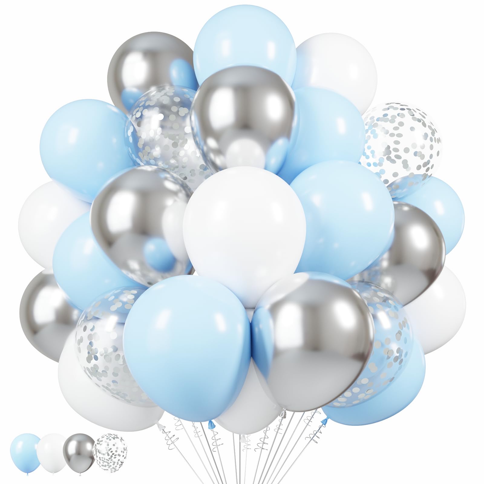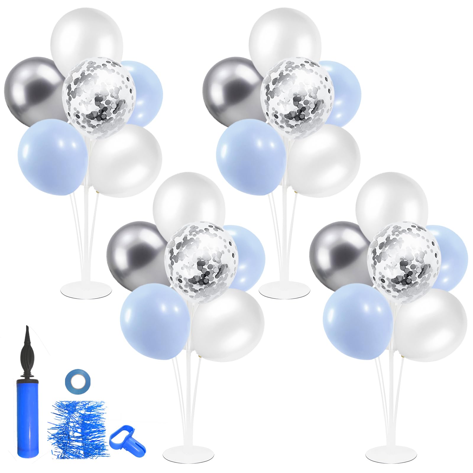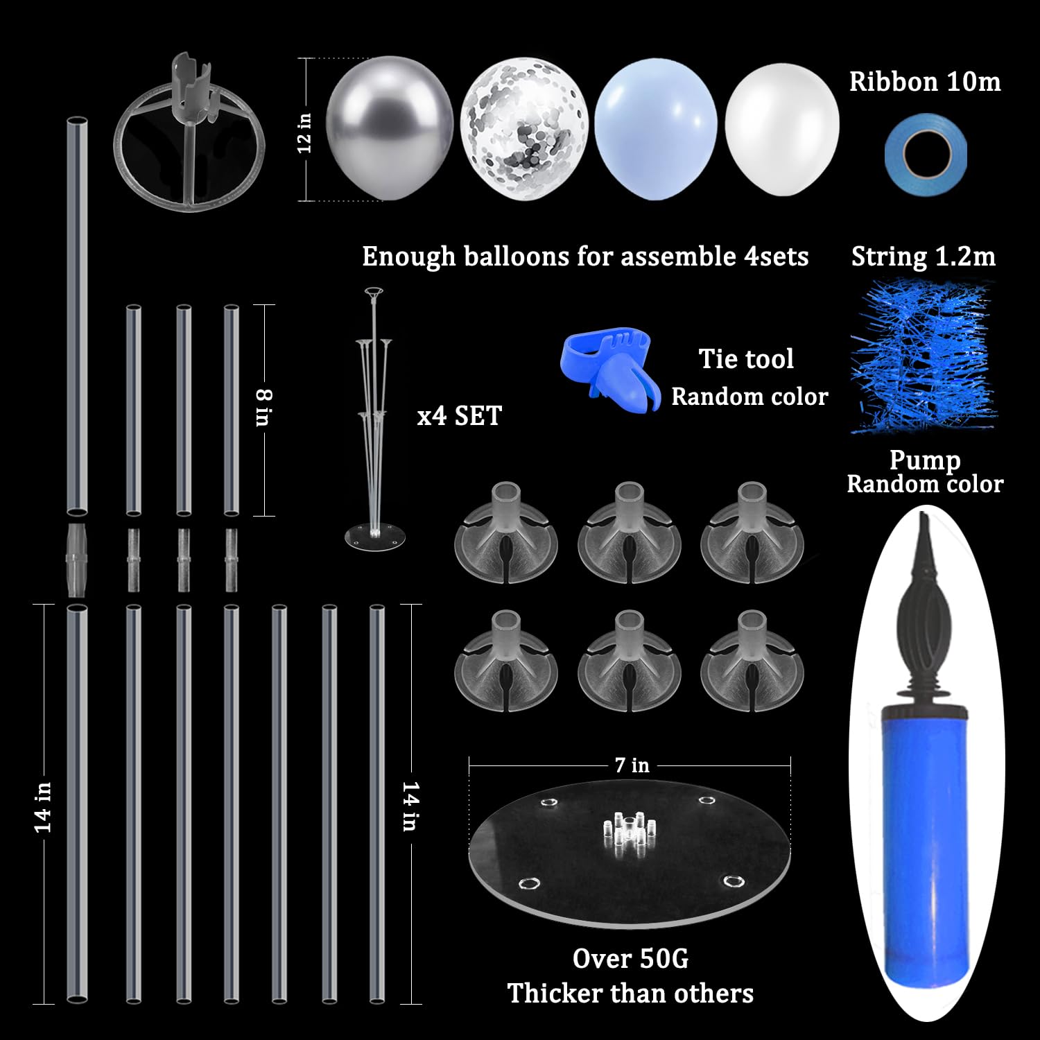 WHAT INLCUDE: This balloon stand kit include 4 set balloon holders, 35pcs balloons - light blue and white balloons, silver and silver confetti balloons, balloon pump, ribbons, glue dots and tie tool