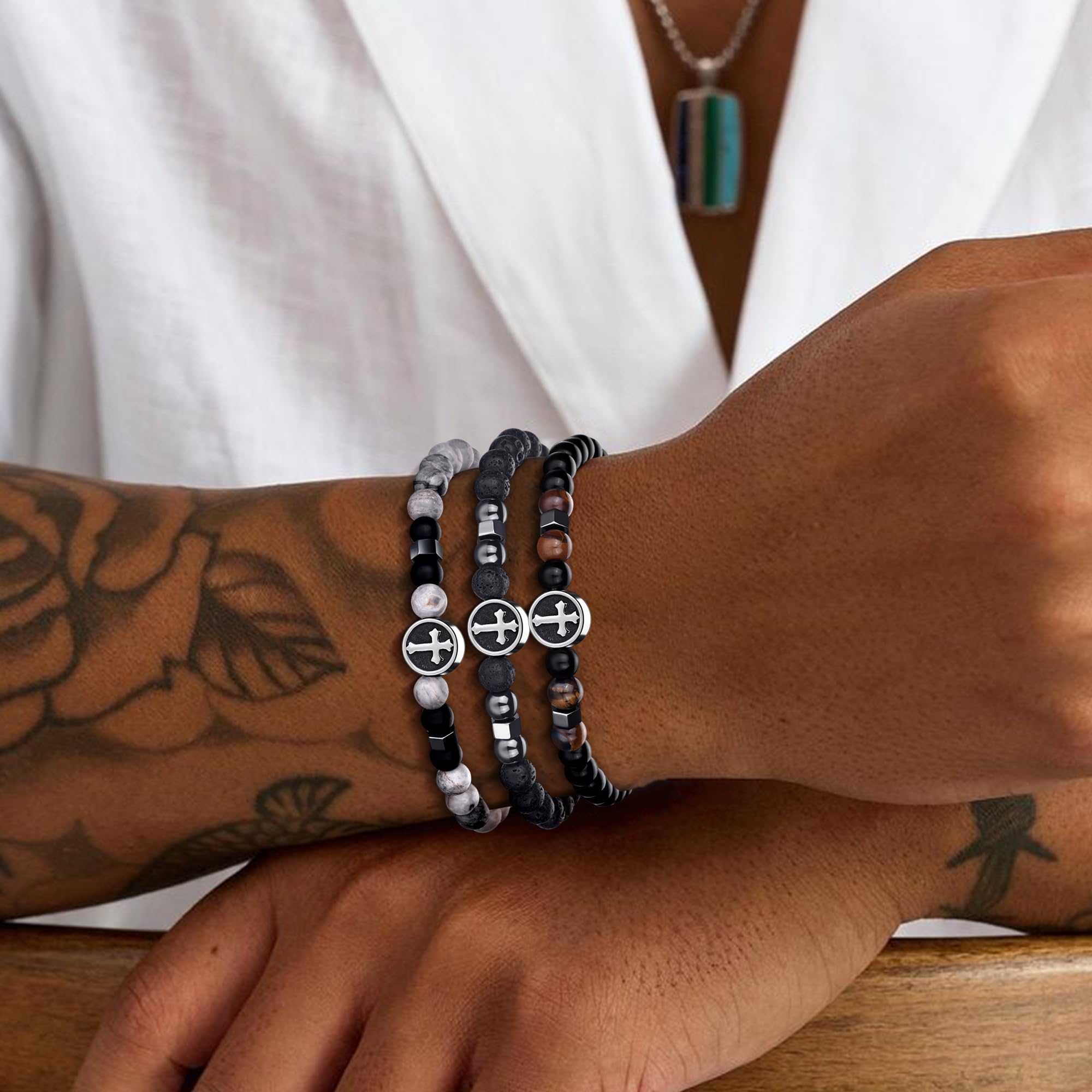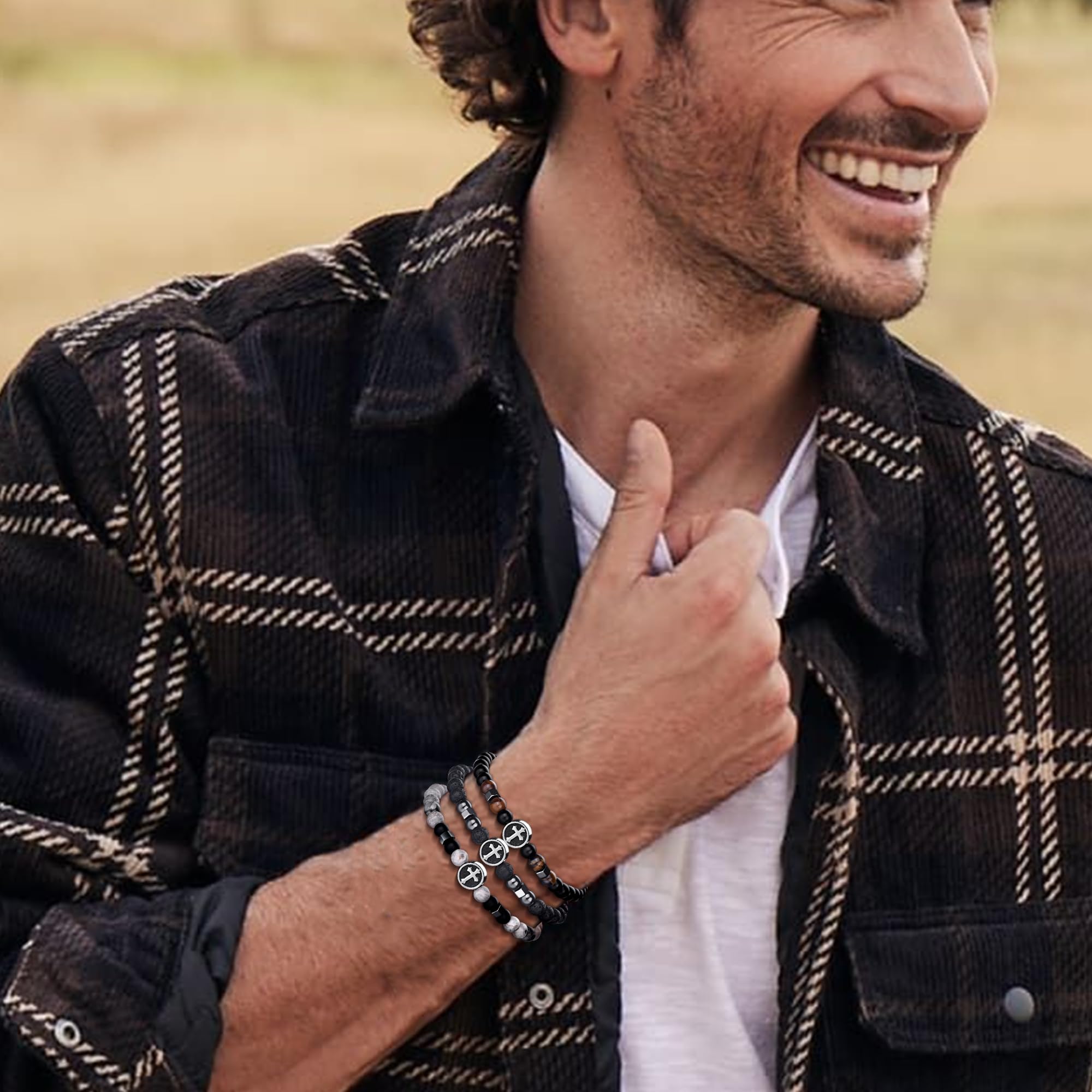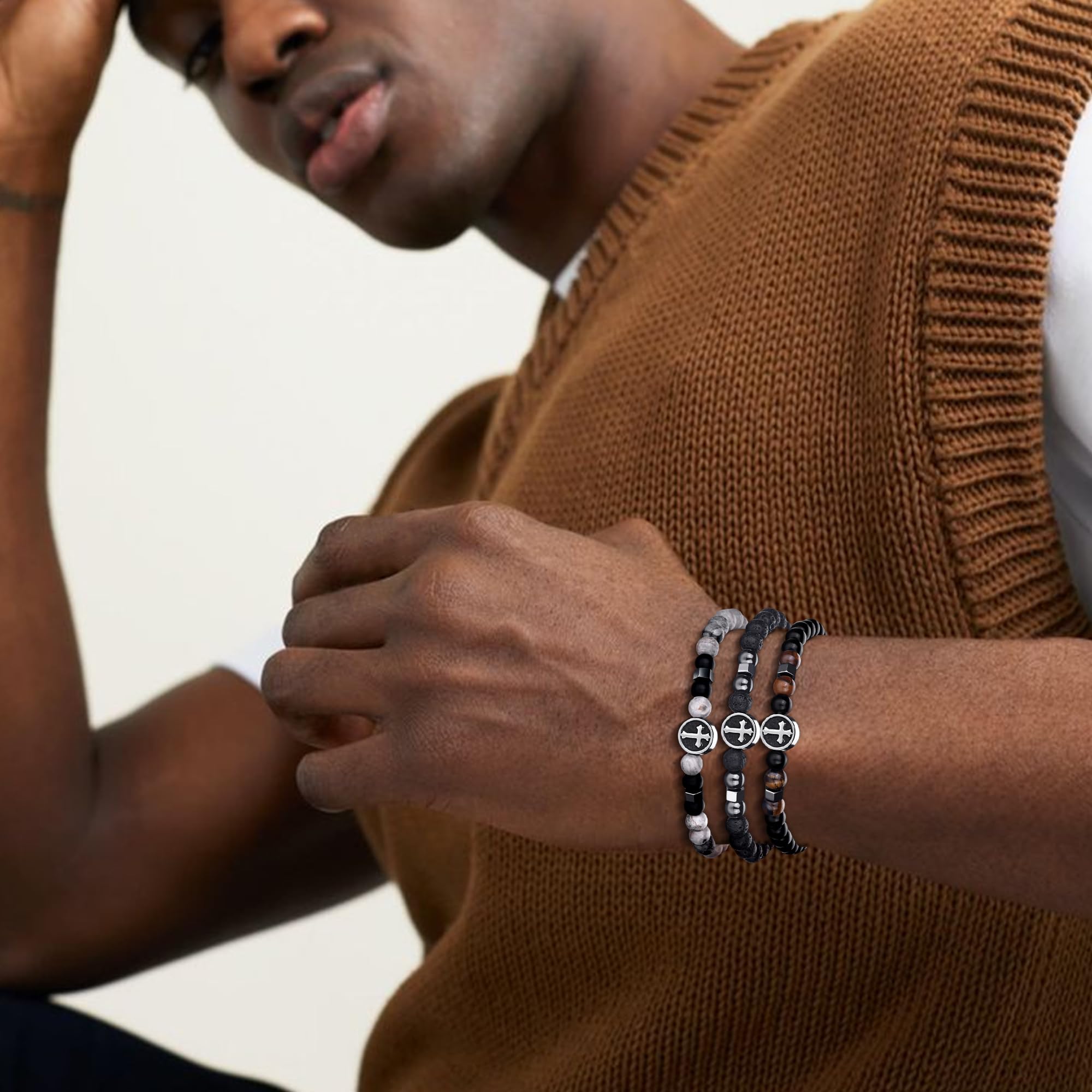 Mens Beaded Bracelet Material:Bracelet for men made of natural tiger eye stone and black matte agate,Natural stone bead possess low density and light weight. Mens bracelet cross cool feeling in hands.You can match with your other jewelry easily to complete your look.Bracelets for men cross will look great no matter what the occasion.