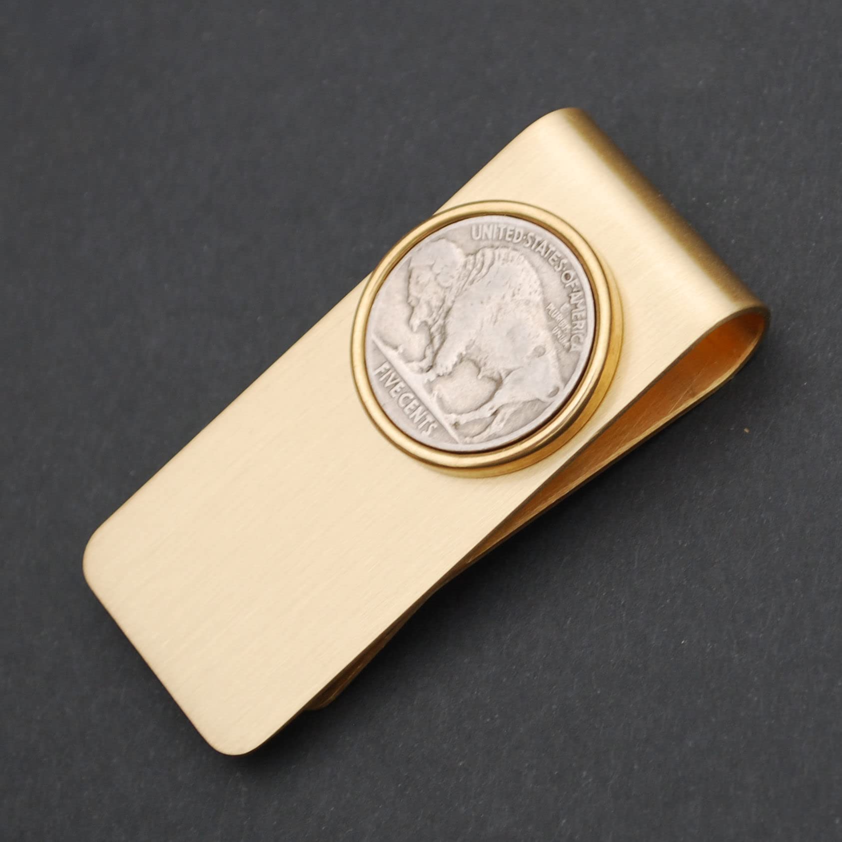 Description You are looking at a gorgeous solid brass money clip, set with an authentic United States 1913 ~ 1938 Indian Head Buffalo Nickel, showing REVERSE Buffalo in front. The coin is average circulated. The clip is about 2.36"(60mm) x 1.03"(26mm), made of high quality brass, eco-friendly, high elasticity, can hold the money very tight and secure, original color without any plating, with a solid brass bezel to hold the coin, brand new and has never been used before. I only use these coins with readable dates, never try to clean them, and always keep their collectible and numismatic values. I hope you end up with one of these beautiful coin money clip. This money clip will be great for holiday gift, investment purpose or just adding to your coin/jewelry collection. I will be happy to combine shipping for multiple items. Thanks!!!