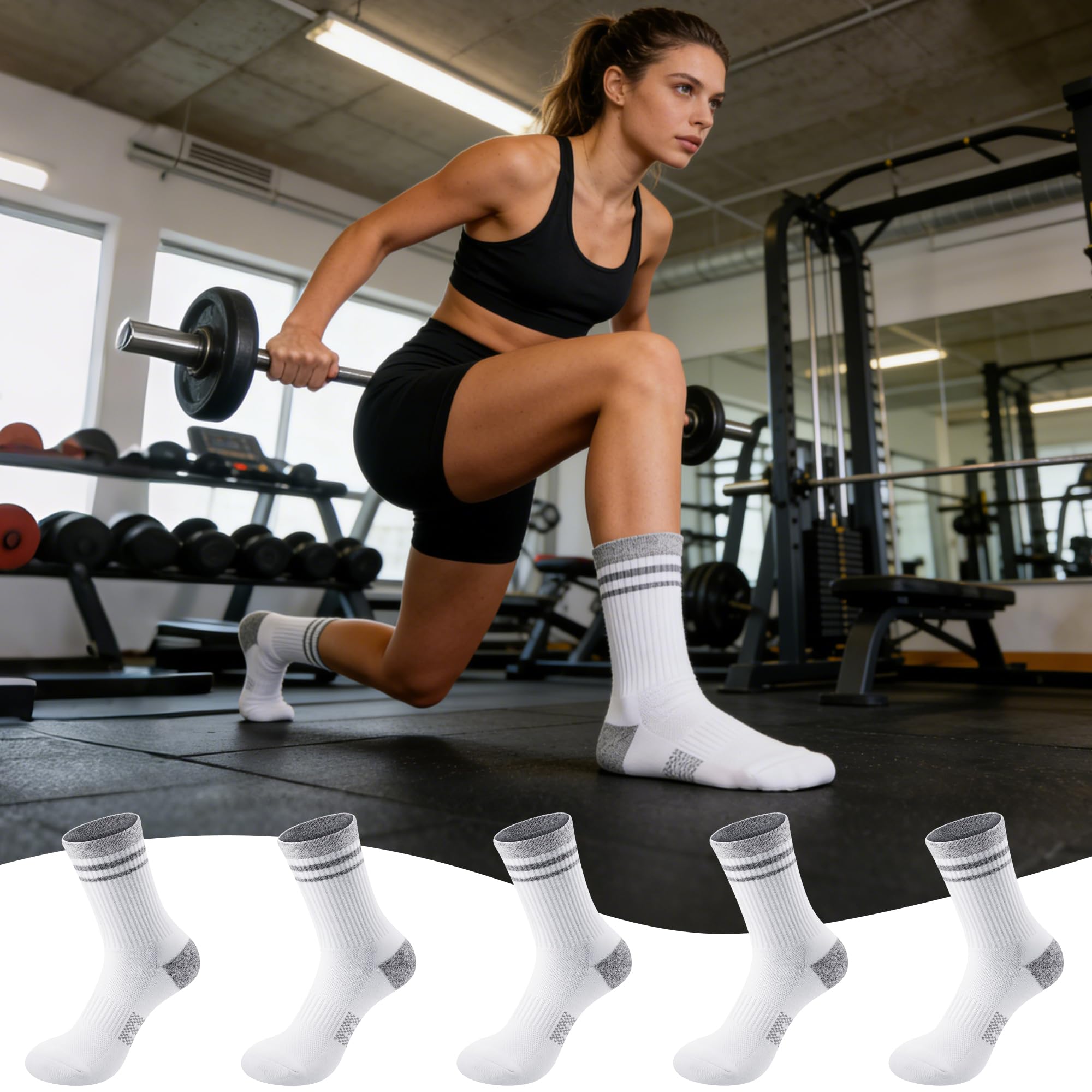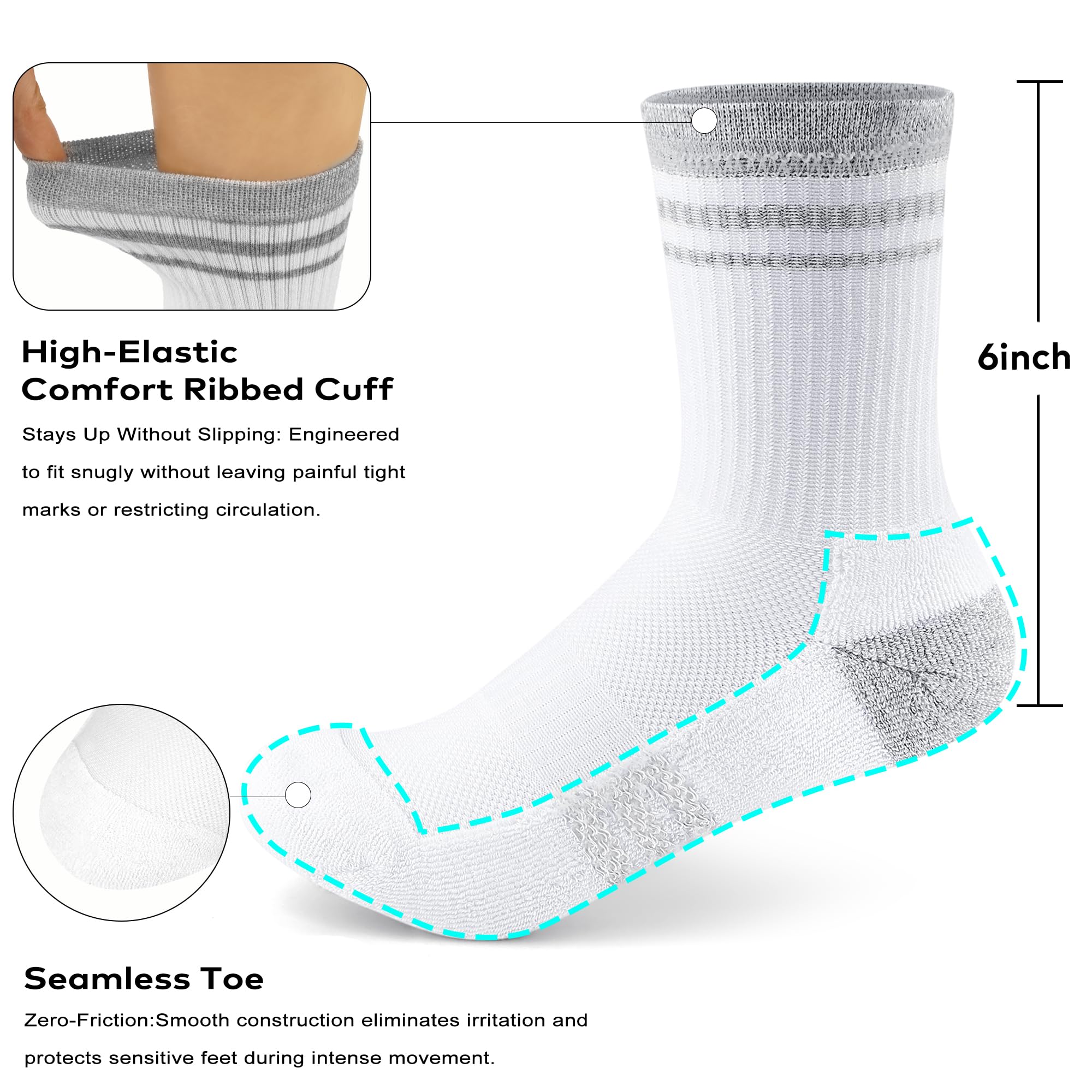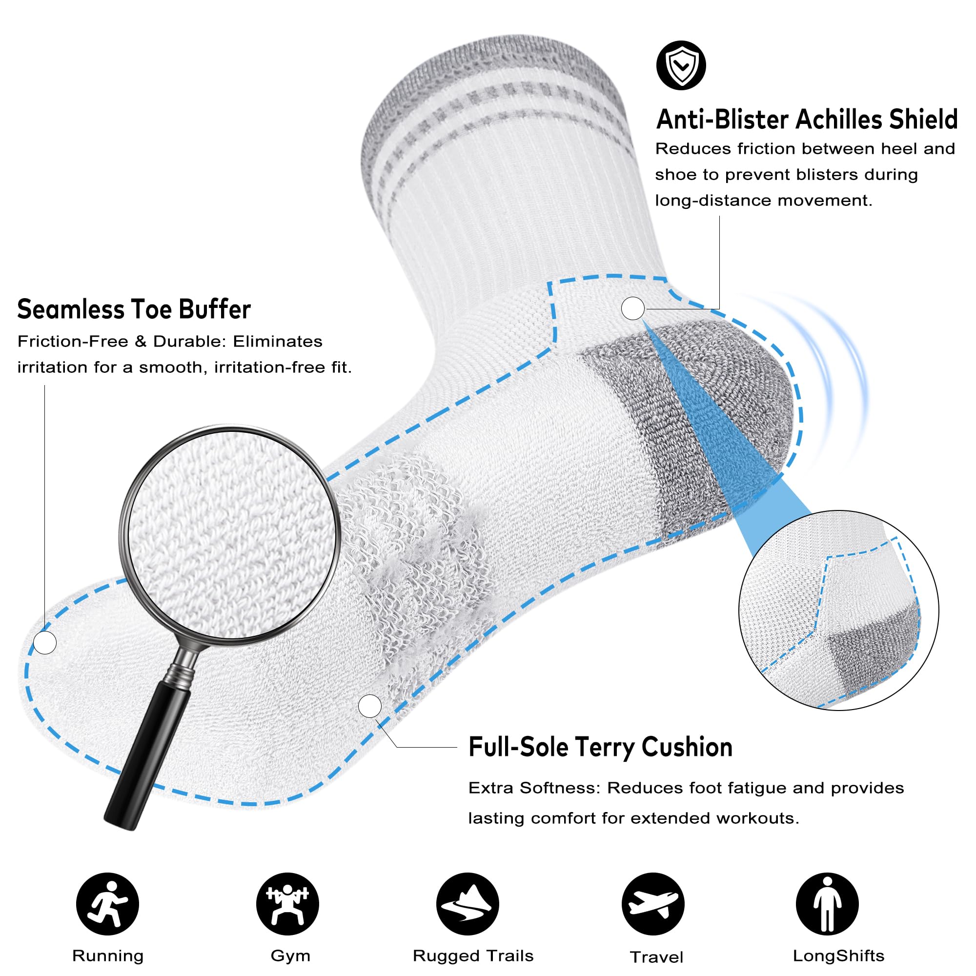 Impact-Absorbing Full Sole Cushioning: Features high-density thickened padding across the heel, toe, and sole areas. These athletic socks are capable of absorbing repetitive shocks and reducing foot fatigue, allowing you to maintain peak performance during high-impact running or gym sessions