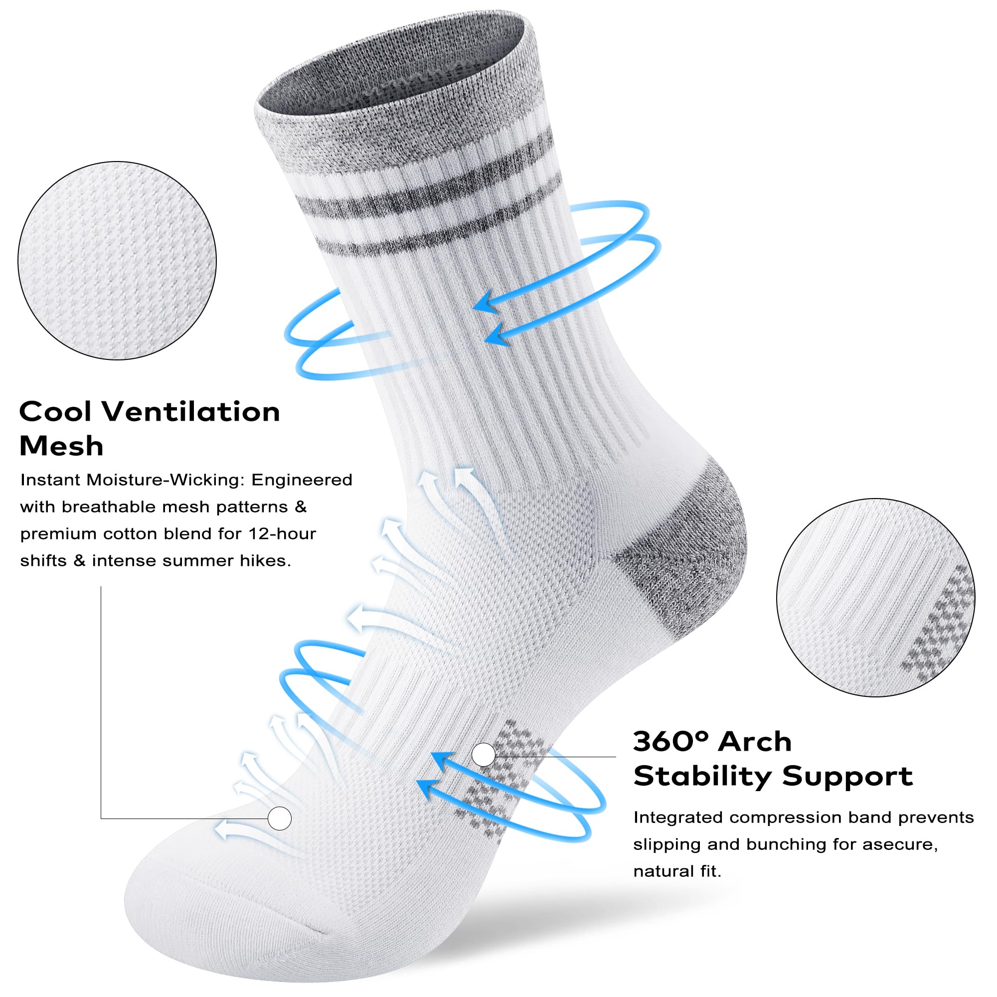 Advanced Moisture-Wicking Breathability: Designed with strategic mesh ventilation panels on the instep to maximize airflow. The premium moisture-wicking cotton blend keeps your feet cool and dry, effectively controlling odor and moisture during 12-hour nursing shifts or summer hikes