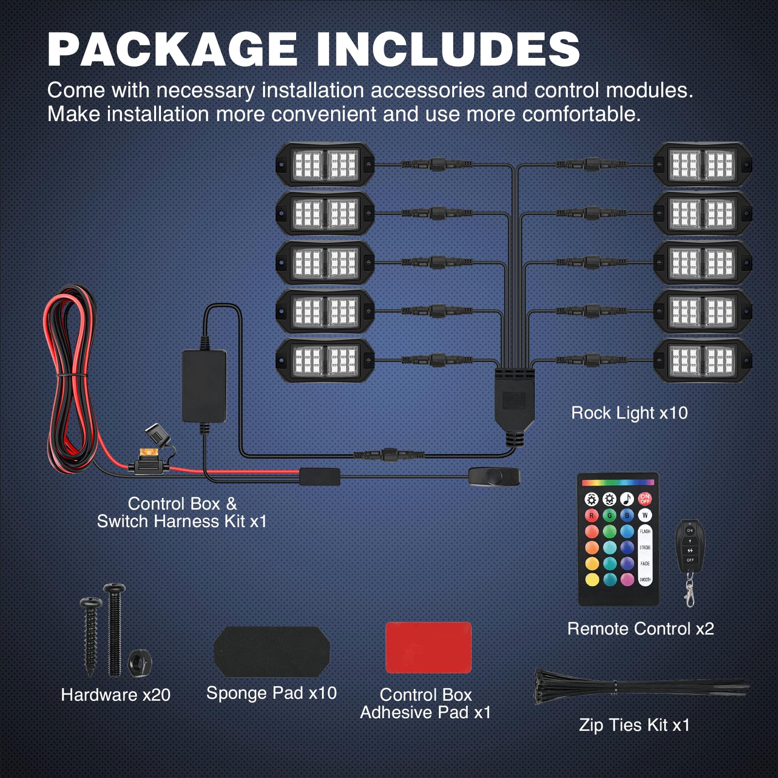 Choose Your Modes: Our RGB rock lights delivers 29 lighting modes (monochrome/ jump/ flashing/ breathing) and 4 different scene modes (party/casual/quiet/lunch break), allowing you to freely set the lighting mode that suits you and your preferences. You can also use the timer function to achieve the timed switch of the light. At the same time, it can synchronize with the microphone and music, making your driving more brilliant