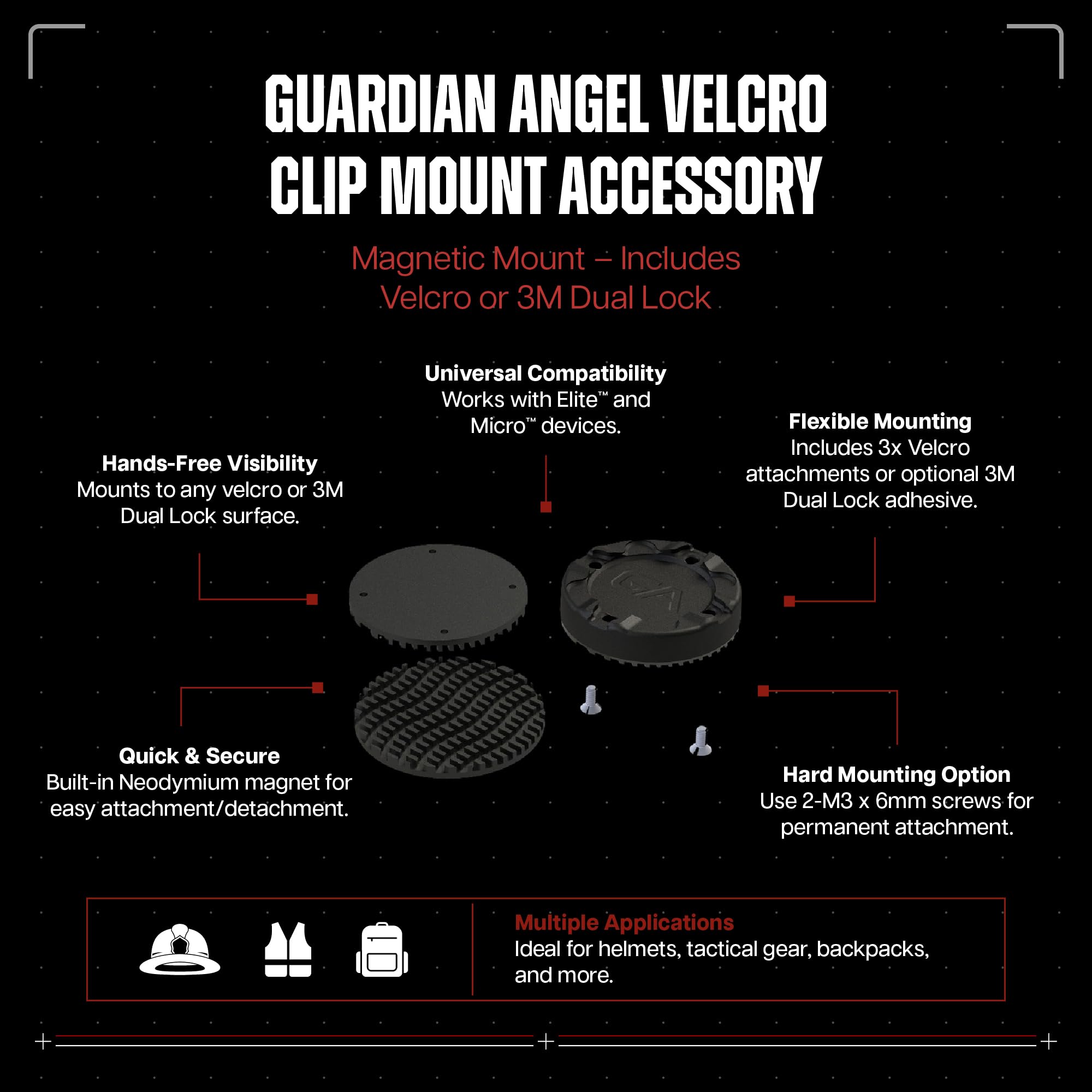 Hands-Free Visibility: The bottom of the mount is covered by strong, 3M extra long Velcro hooks to mount to any Velcro loop surface. Includes optional 3M Dual Lock adhesive attachment (use instead of Velcro.) 3x Velcro attachments included. Magnetically attaches to any Guardian Angel device.