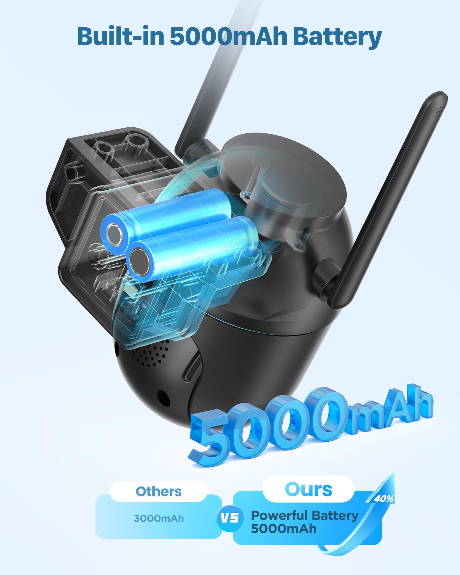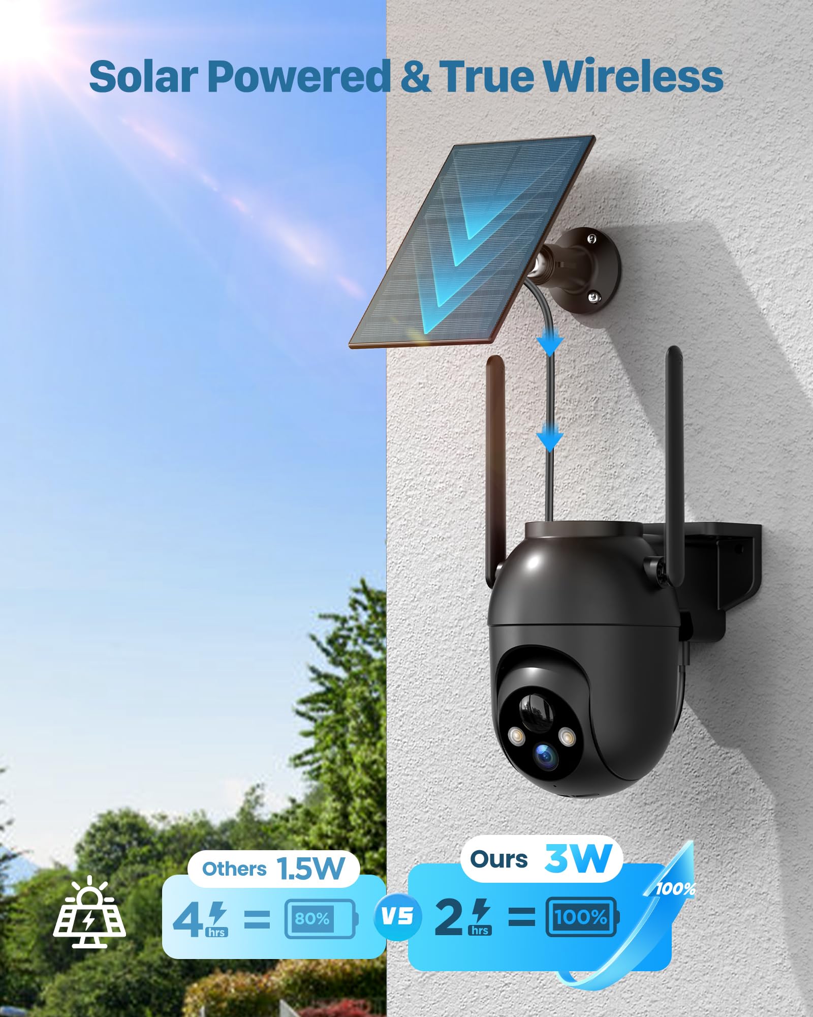 【Eliminate Tedious Charging Steps】The solar camera is equipped with a solar panel and a powerful lithium battery, which allows it to be charged by solar energy during the day and powered by the battery at night, never worrying about low battery. Let you completely avoid the trouble of climbing a ladder to remove the outdoor camera for charging.