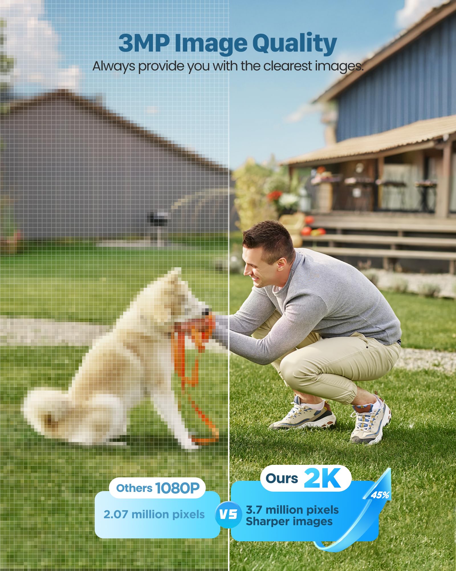 【360° Rotating & 2K Color Night Vision】 - Security cameras wireless outdoor can rotate its head 350° horizontally and 115° vertically. Equipped with 2 infrared LEDs, 3MP FHD resolution (2560*1440), 110° viewing wide-angle, the outdoor camera wireless allows you to remotely shoot and watch up to 65ft range of clear pictures and videos. How a nice camera for home security!