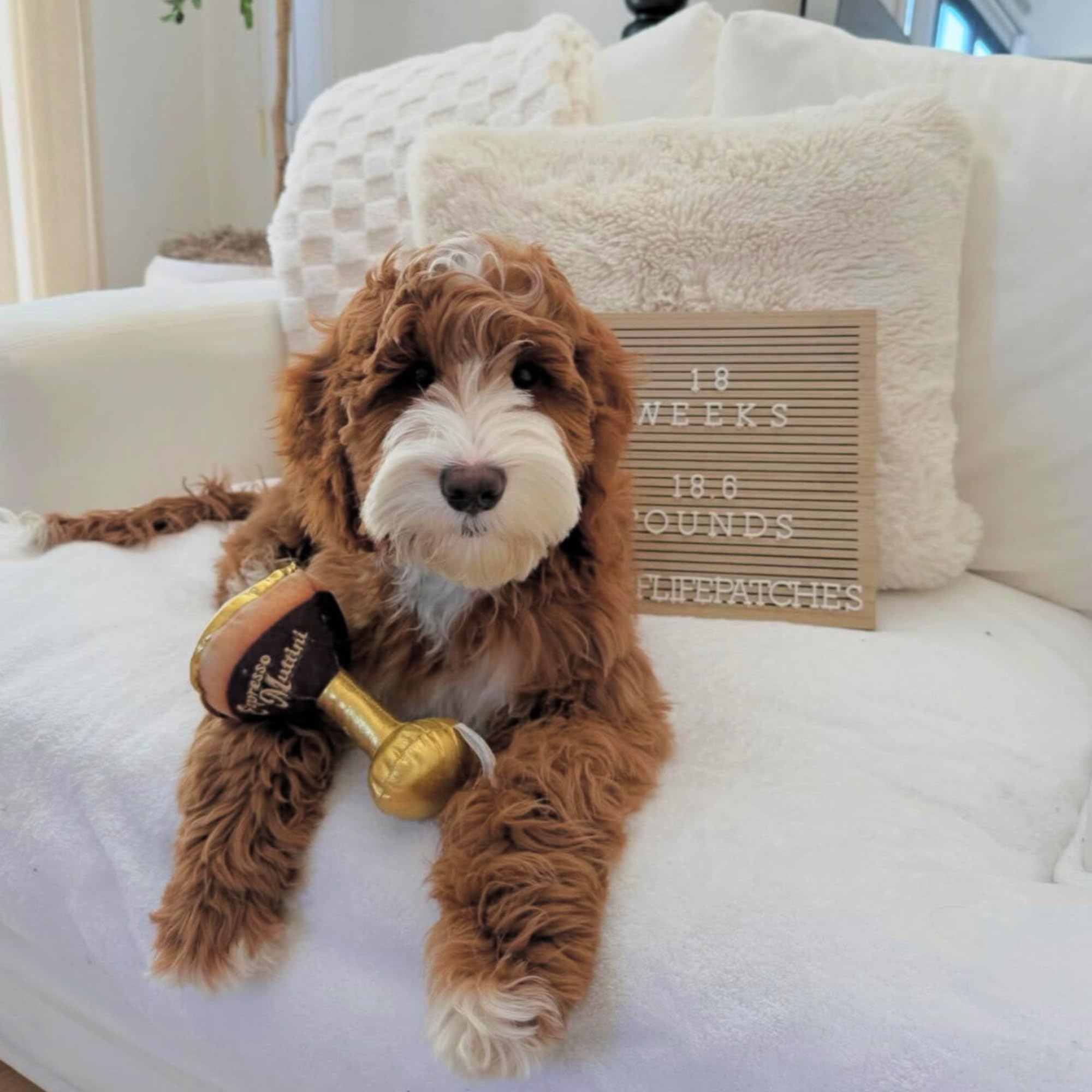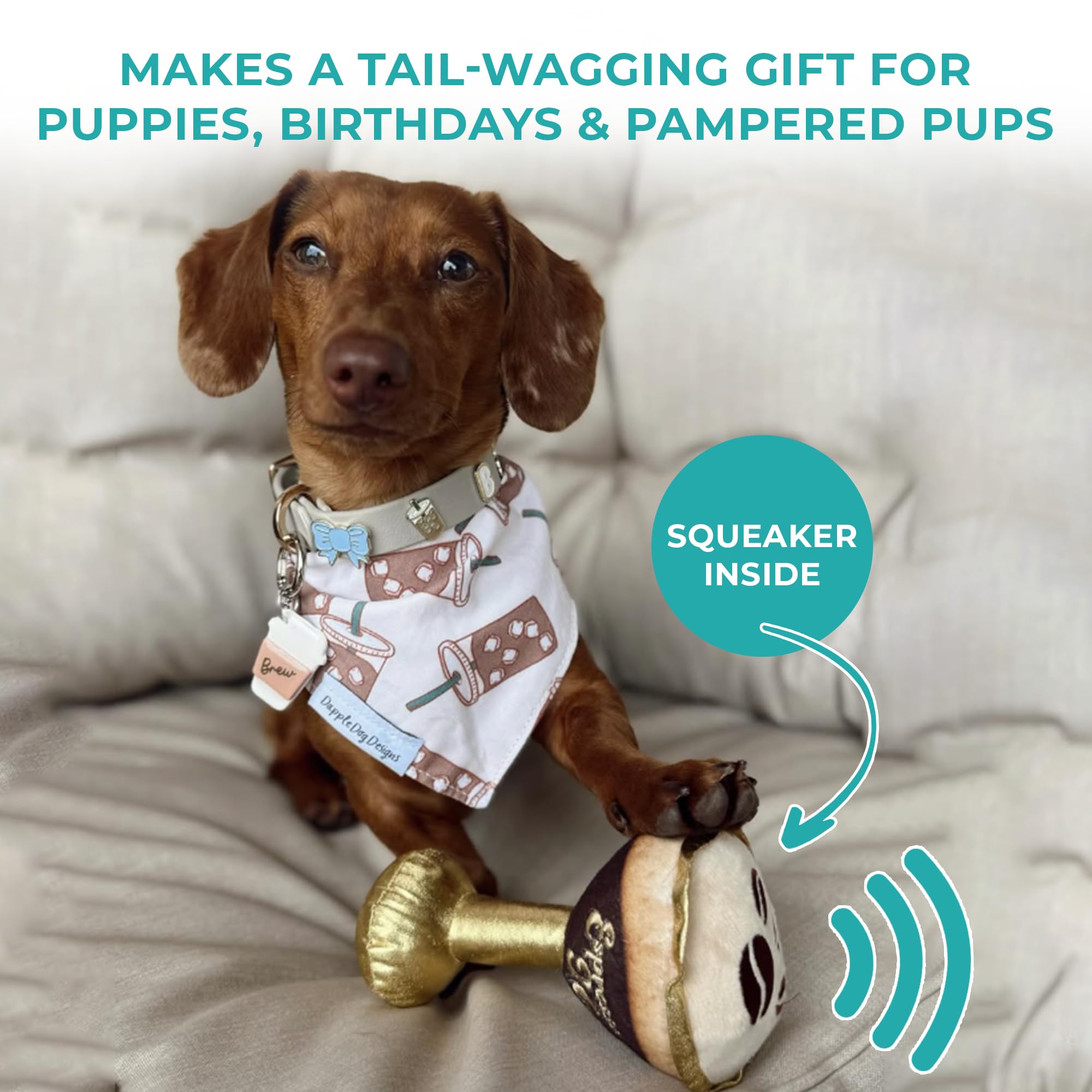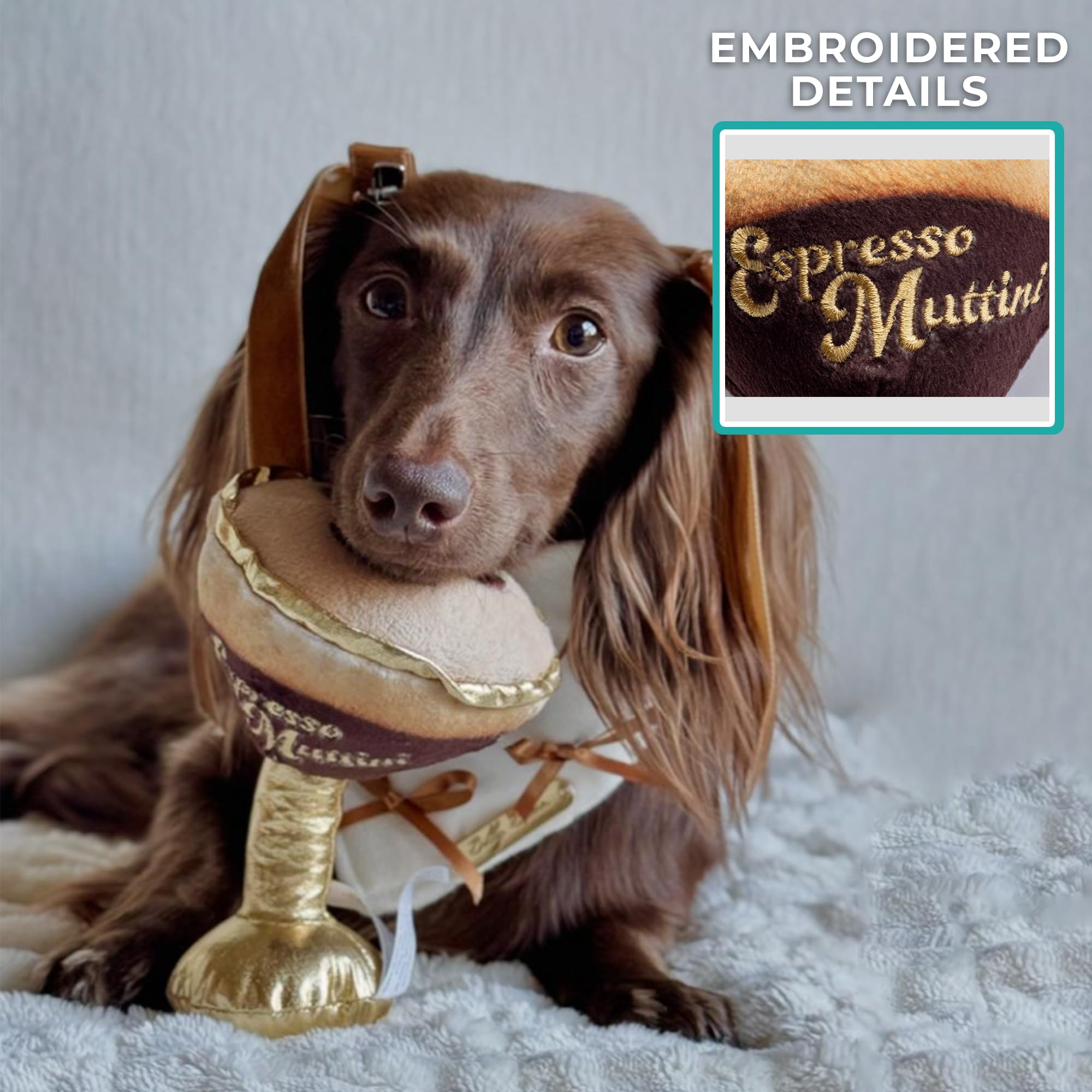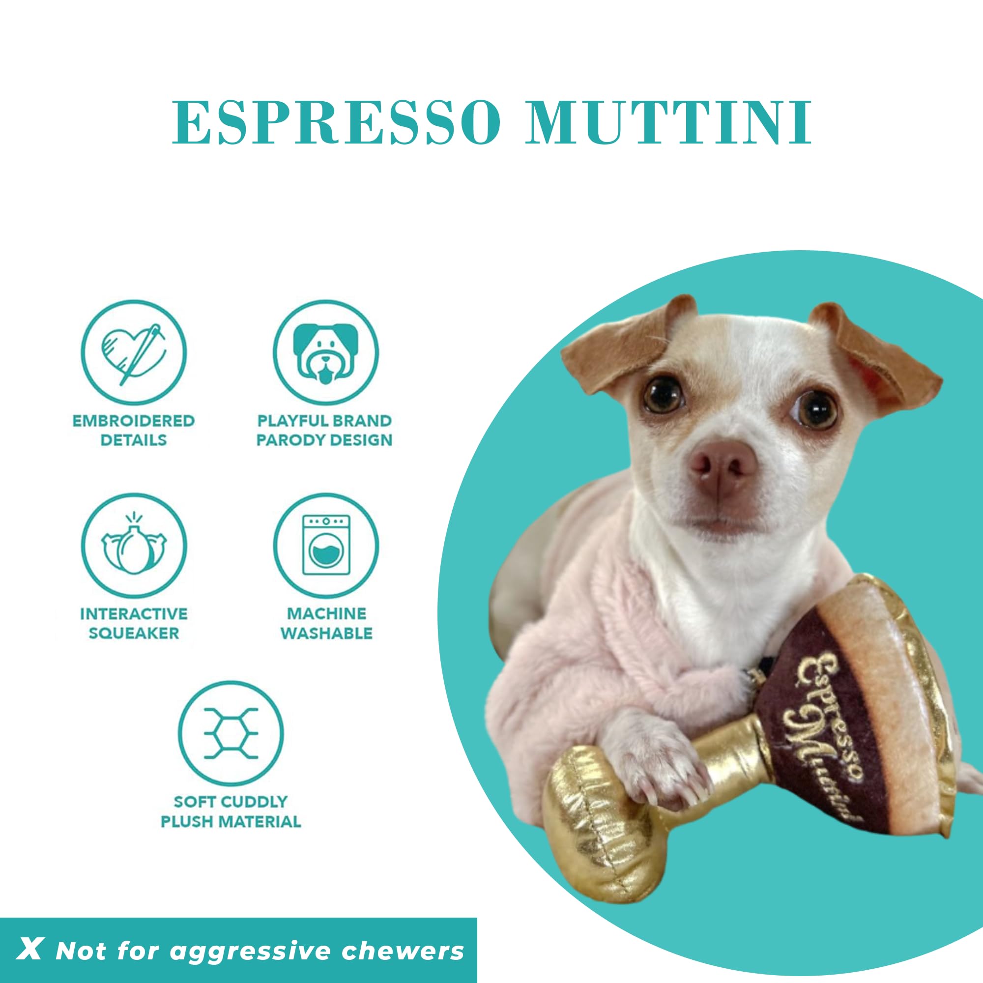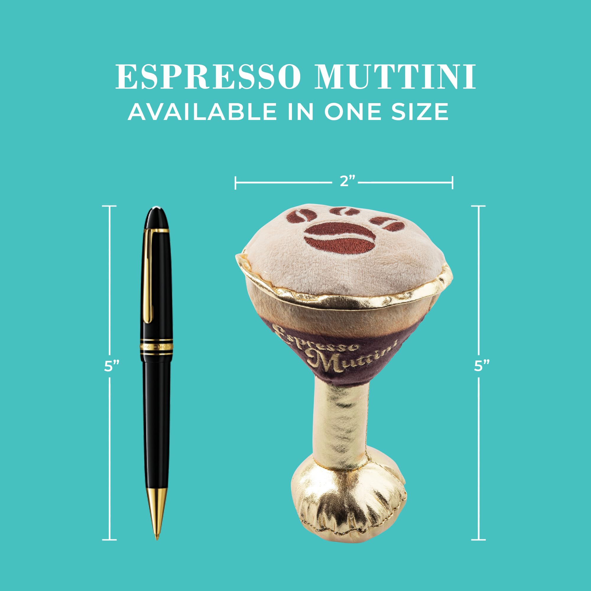 Funny Parody Plush Dog Toy: We know your pooch runs on puppuccinos, so why not shake things up with our Espresso Muttini dog toy? This funny dog toy features a rich mocha and cream-colored design with gold accents and a built-in squeaker hidden inside. It’s a fun, cute interactive dog toy that turns every playtime into happy hour! One Size: 5"x3"x2"