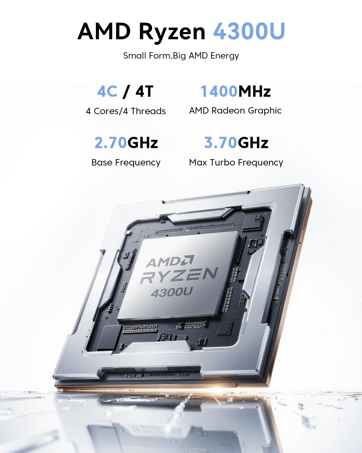 Next-Gen Performance in a Compact Powerhouse: Meet the KAMRUI Pinova P1 Mini PC—powered by the AMD Ryzen 4300U processor (4 cores / 4 threads, base 2.7GHz, boost up to 3.7GHz). With a 25% higher base clock and ~10% better multi-threaded performance than typical entry-level chips like N-series, it outperforms the i3-10110U by 50% and the Ryzen 5 3500U by 15%, it handles demanding tasks—like multitasking, light video editing, or even basic 3D rendering—with noticeably smoother responsiveness