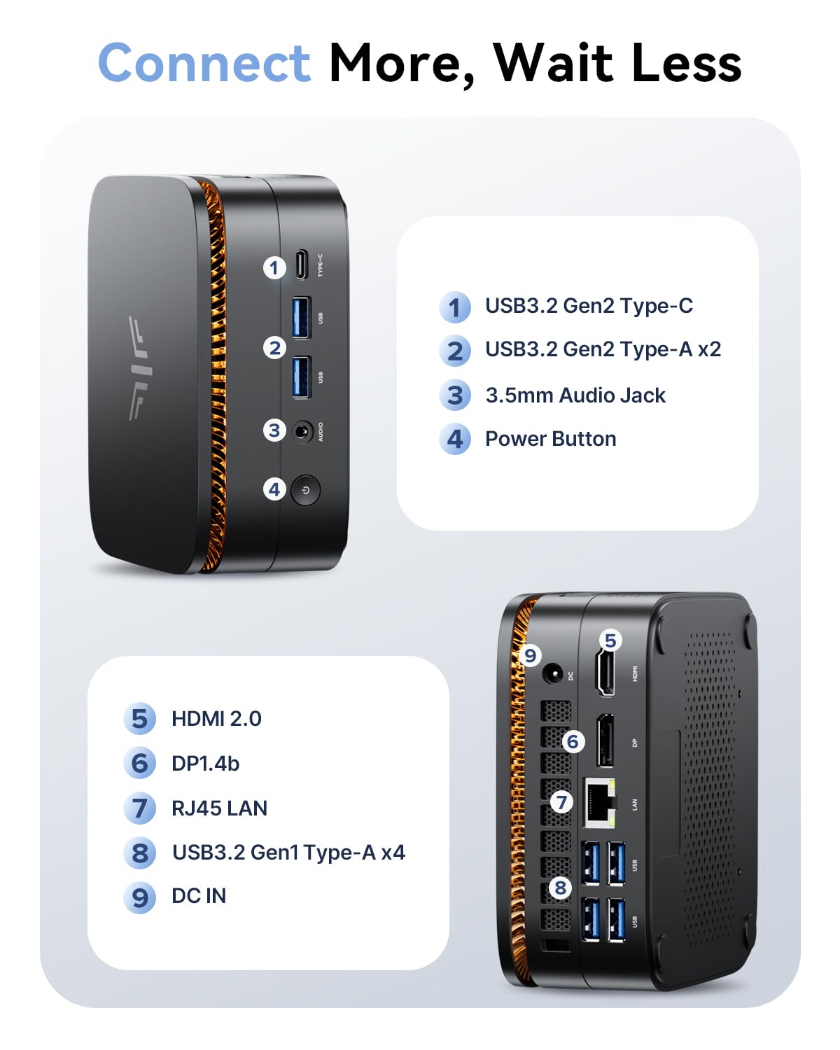 All the Ports You Need, No Dongles Required: 6× USB 3.2 ports (for keyboards, drives, peripherals), 1× USB-C port (data + DisplayPort 1.4 video output), HDMI 2.0 + DisplayPort 1.4, Gigabit Ethernet, 3.5mm audio jack. Plus smart features like Auto Power-On, RTC Wake, and Wake-on-LAN—ideal for digital signage, home servers, or always-ready workstations