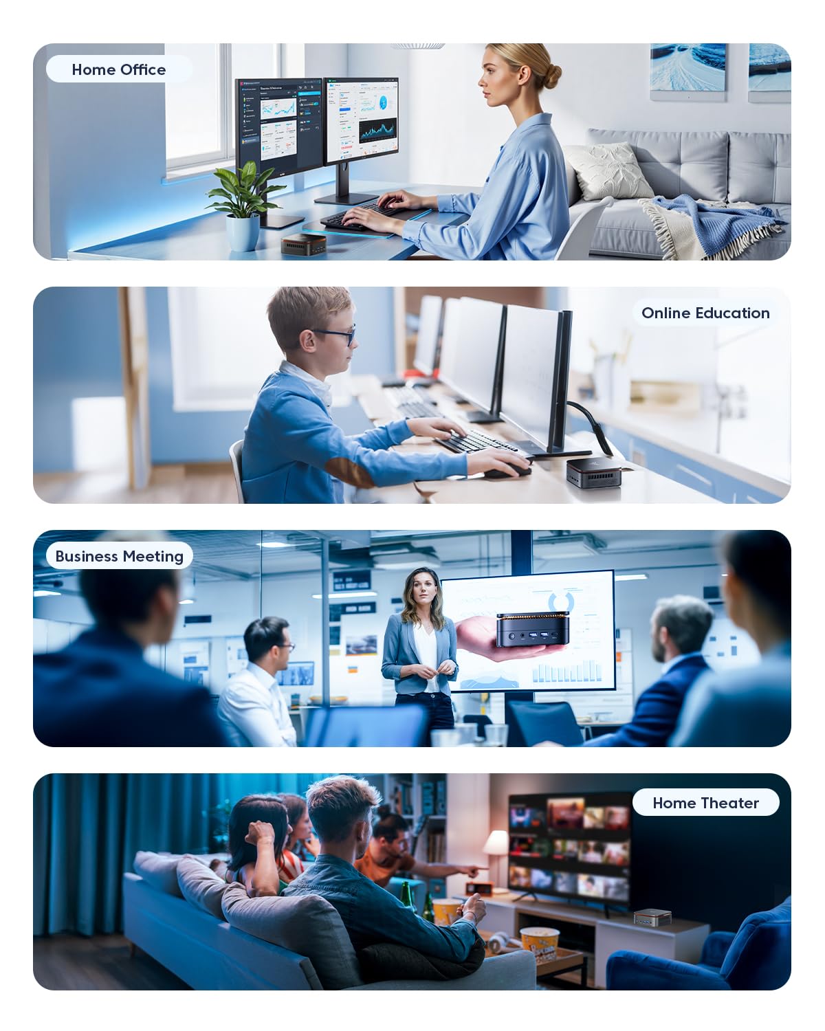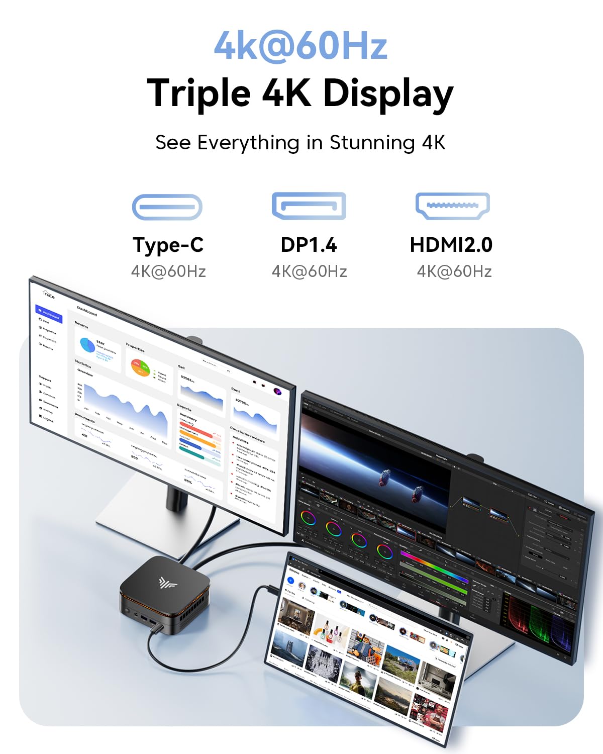 Triple 4K Display Support – Not Just Dual: Why settle for dual monitors when you can go triple 4K? The Pinova P1 Mini Desktop PC delivers what most entry-level mini PCs can’t: simultaneous output via HDMI 2.0, DisplayPort 1.4, and USB-C (with DP Alt Mode). Powered by AMD Radeon graphics (up to 1.4GHz), it offers 3–4× the graphics performance of UHD integrated solutions, making multi-screen productivity or immersive entertainment truly seamless