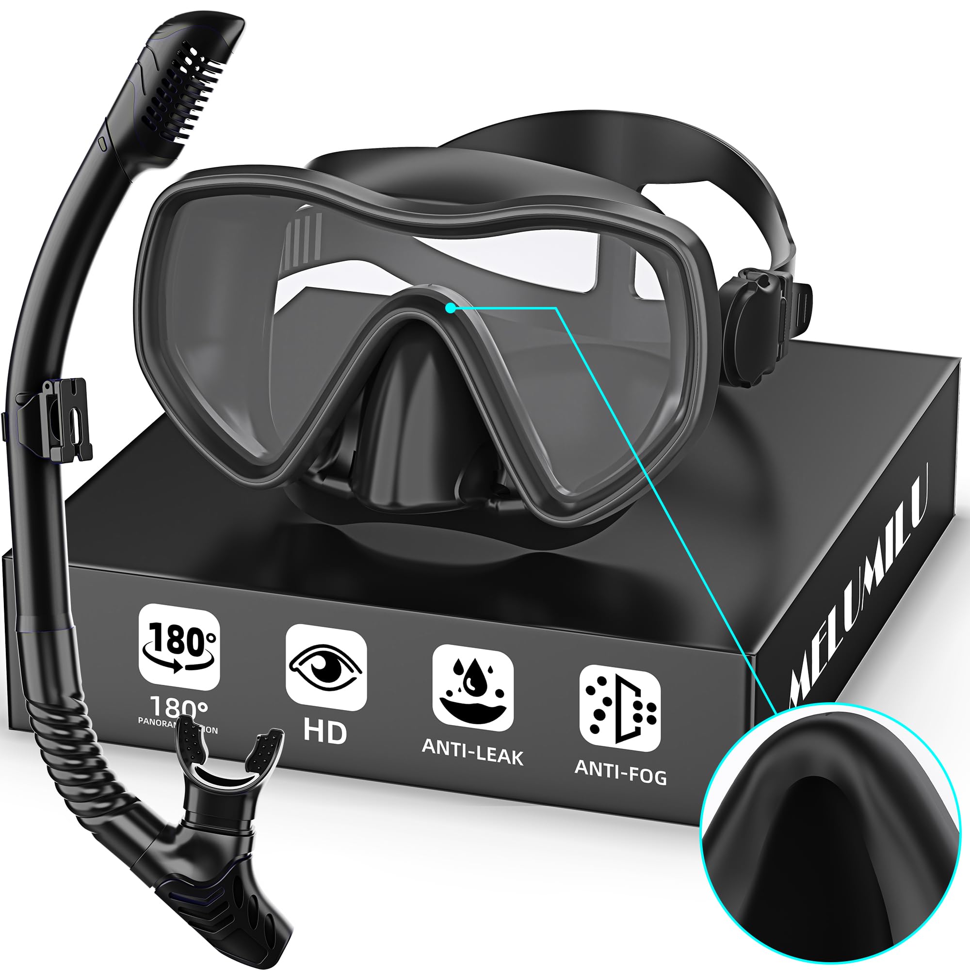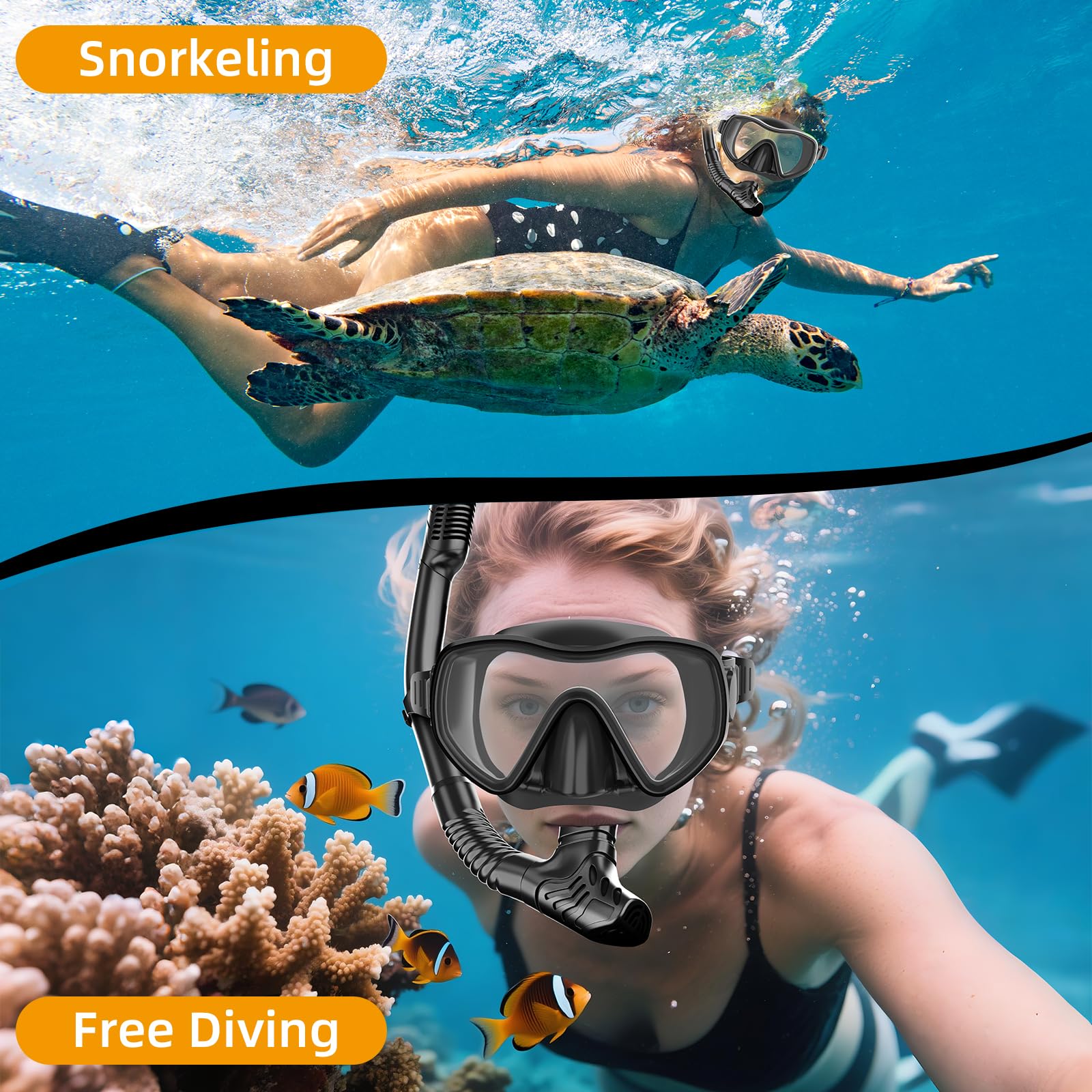 Panoramic Snorkel Mask: This snorkel mask features impact-resistant tempered glass lenses, which are resistant to scratches. Combined with anti-fog technology, it offers a 180° panoramic view, allowing for clear viewing of fish and coral swimming underwater, delivering an immersive underwater experience