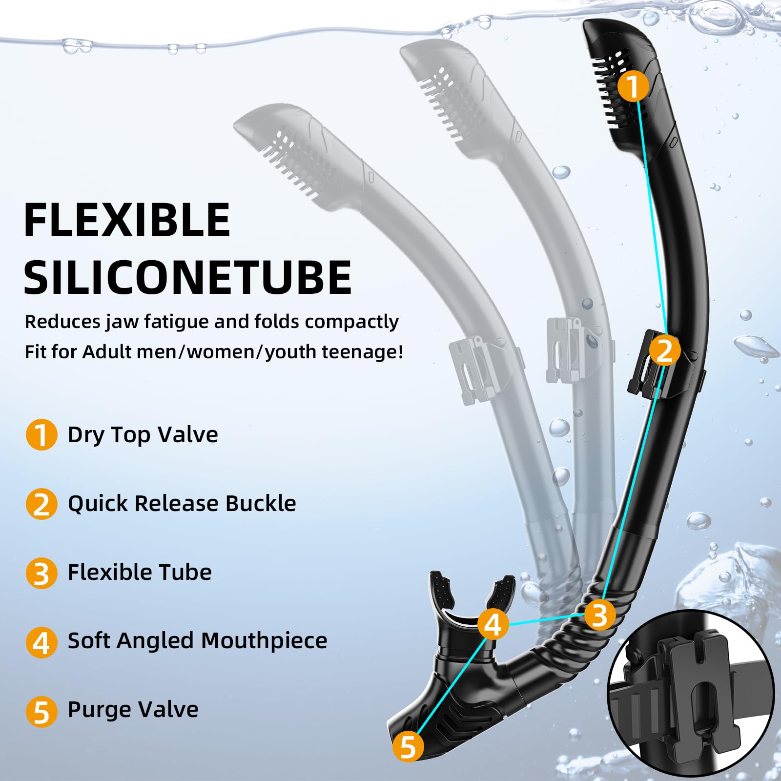 Dry Snorkel: Top float valve and one-way exhaust hole prevent water entry and drain quickly, ensuring smooth breathing. Low breathing noise reduces self-disturbance and impact on underwater creatures, enhancing immersion