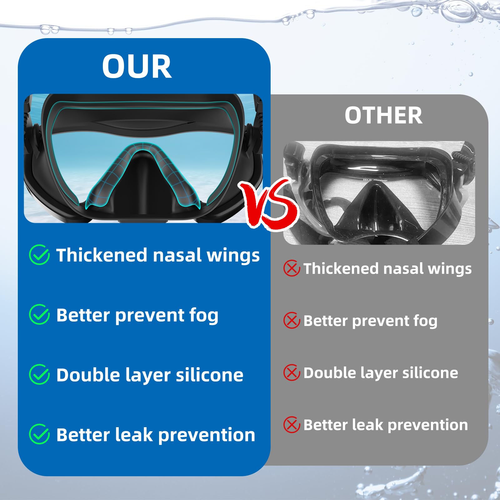 Upgraded Silicone Nose:Enhanced silicone nose pad with thicker nasal alae design. Its double-layer silicone boosts anti-fog and water resistance. Wearing feels natural and comfortable with little pressure, needing no frequent adjustments during snorkeling for easier enjoyment of underwater wonders