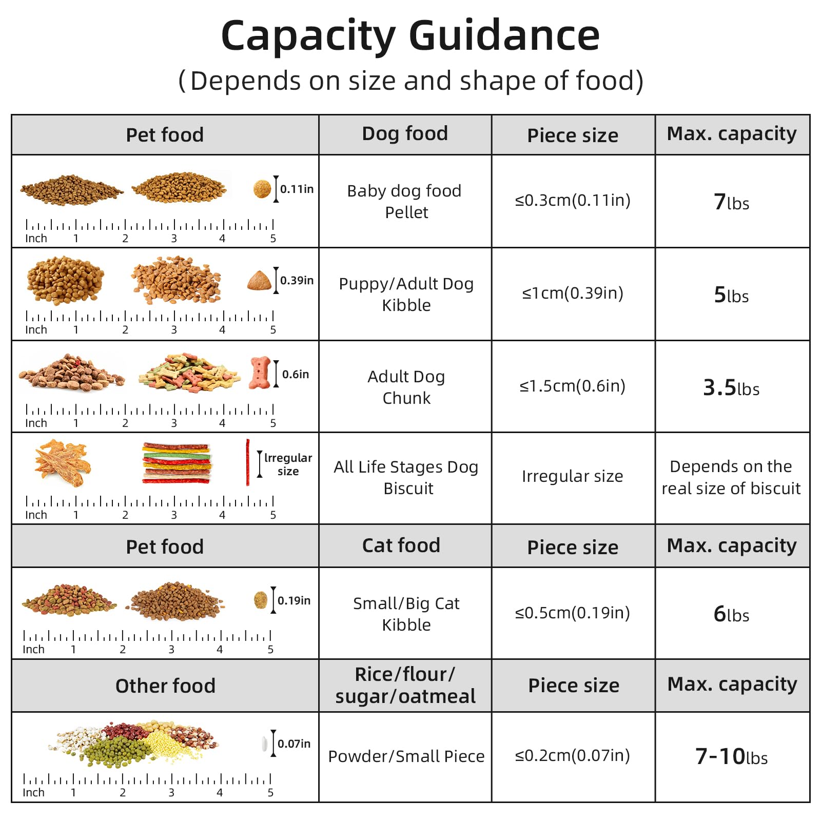 CAPACITY : Our Pet dry food storage containers , cat food storage container combination capacity is 14 LBS, and can hold approximately 10 -14 pounds of pet food and rice,Depends on the size of the food。It also works well with regular kitchen food,Such as rice,flour,cereal,beans,nuts,snacks or whatever you like。