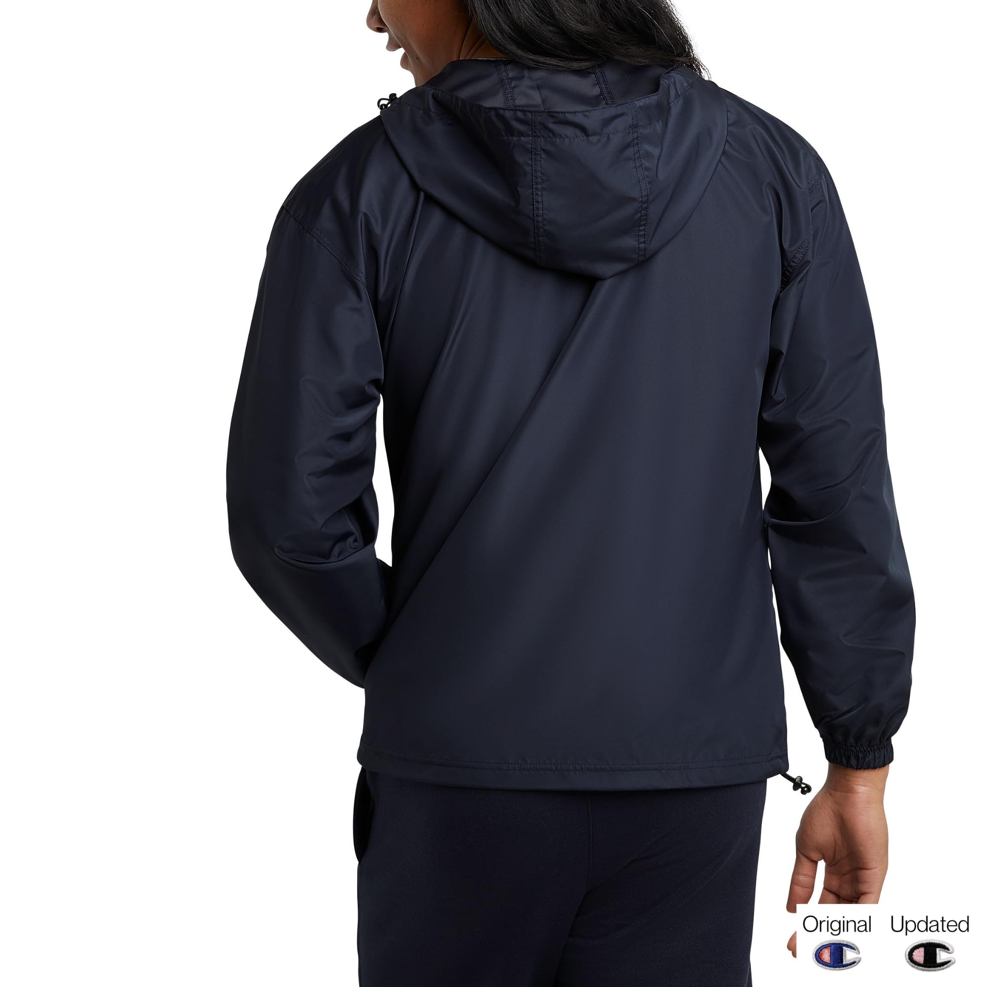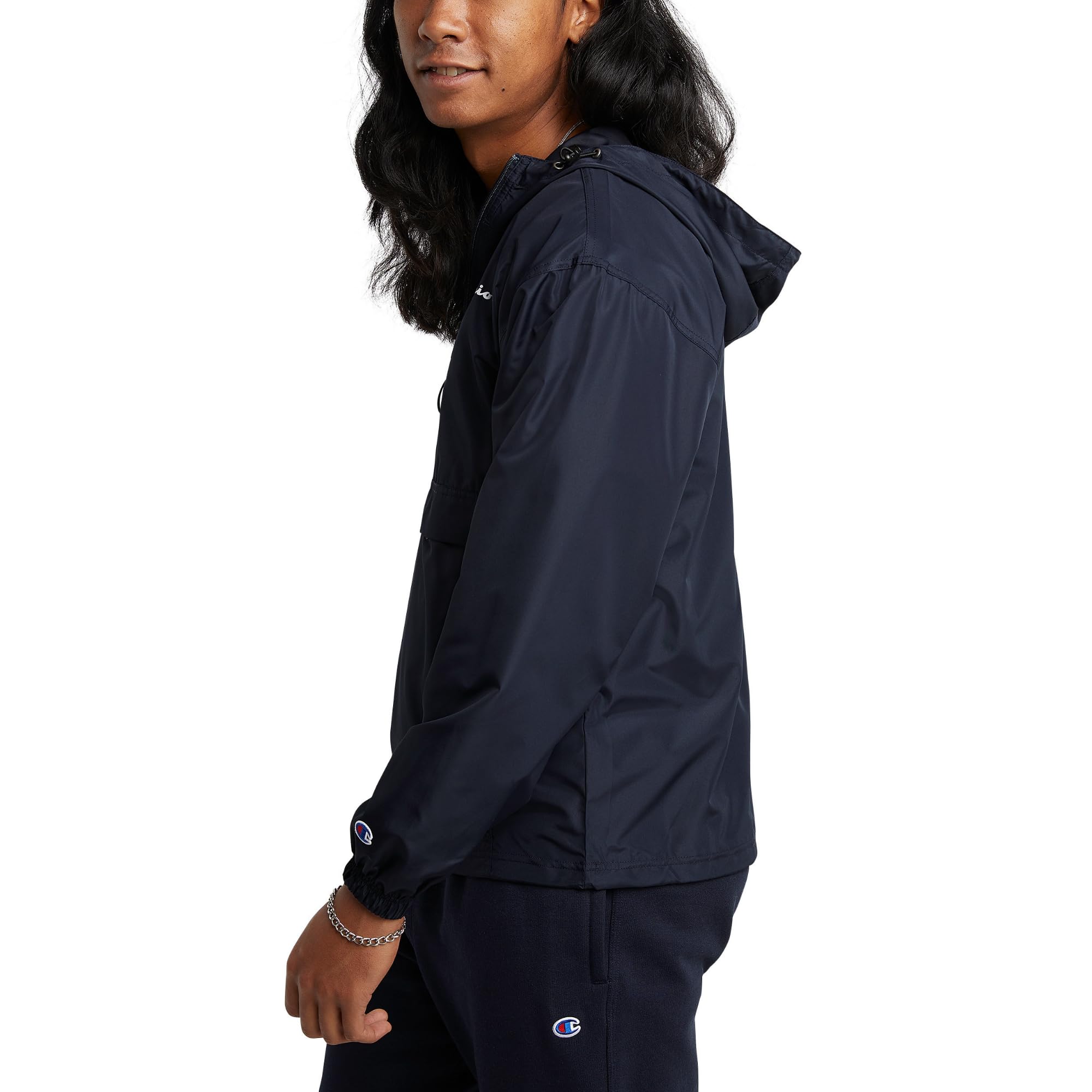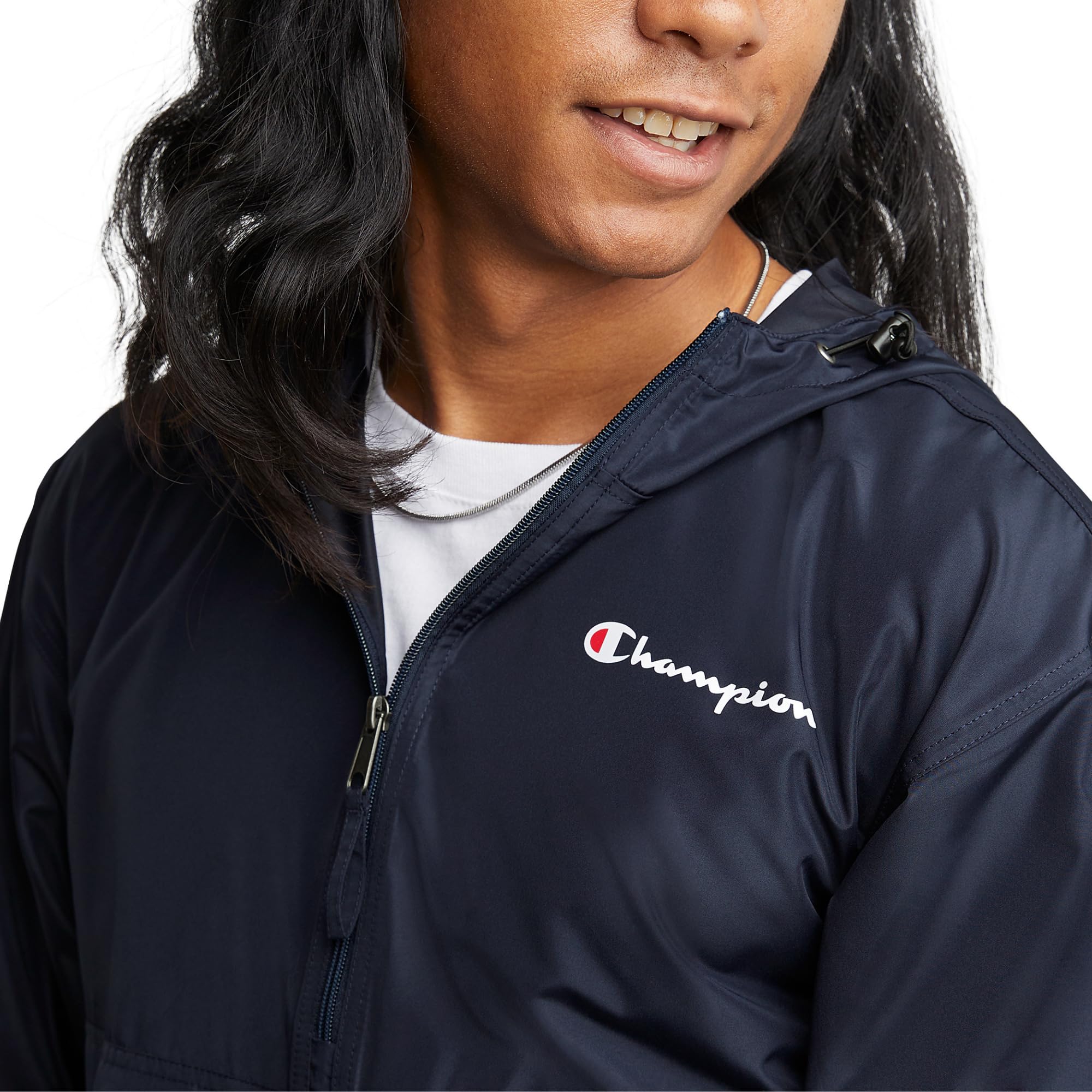 Description WEATHER ANY STORM. Wind-resistant and water-resistant, this ultra-light men's rain jacket can be towed along on all your outdoor endeavors. Ready to protect you from the elements, it features a full-zip front, a scuba-style neckline, and a hood with a bungee cord closure. This jacket is roomy enough for easy layering over your best Champion sweatshirt. Smart details include rain flaps in front and back, elastic cuffs that keep out wind and rain, and a bungee cord hem that adjust for a custom fit. This rain jacket for men has front pockets that keep essentials close. The iconic script logo at the left chest is recognizable on and off the field.