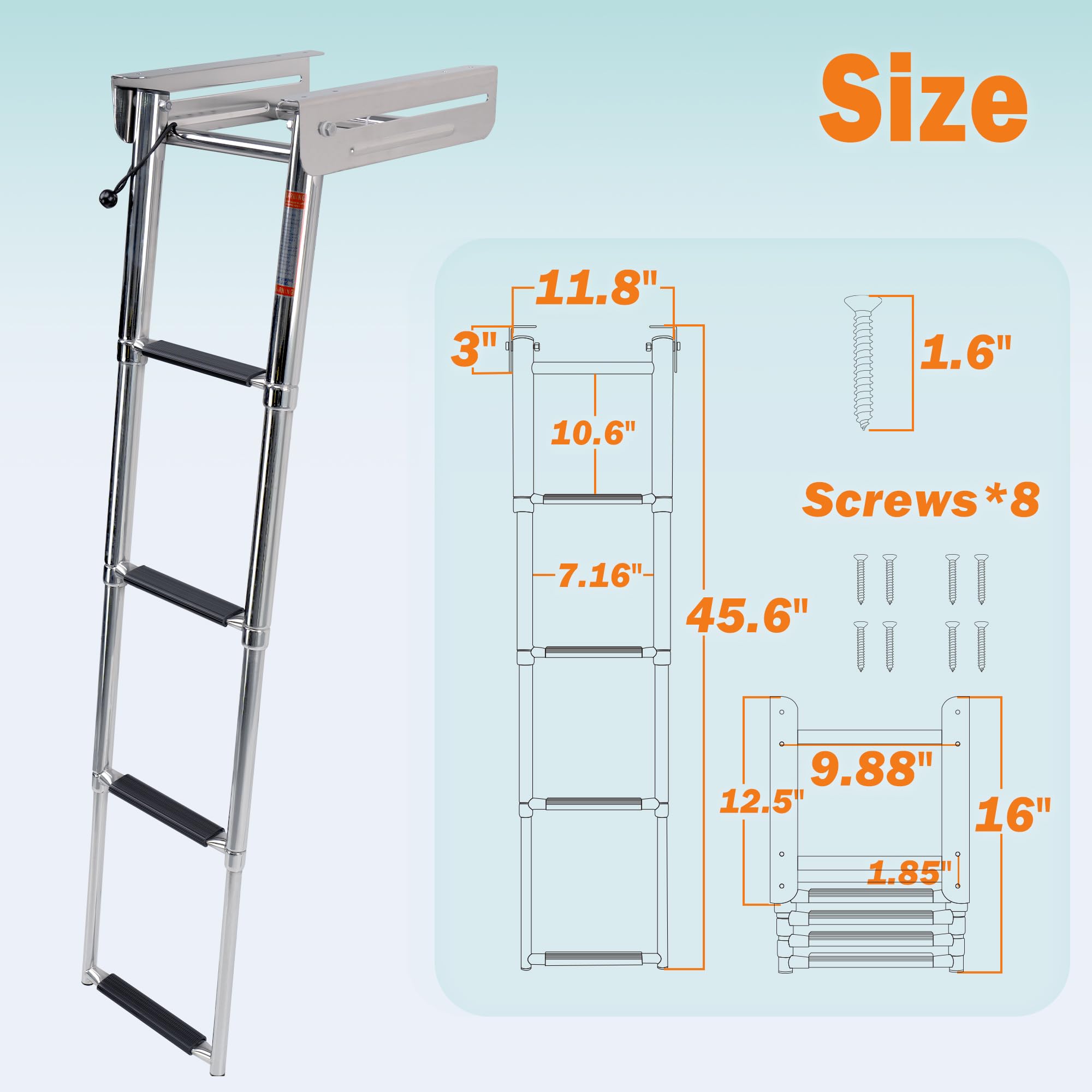Dimensions: Length deployed: 45"(115cm) Length stowed: 16"(41cm) Overwidth width: 11.8"(30cm) Mount width: 12.5"(32cm) Superior Construction Our boat ladders are constructed of marine grade stainless steel and have a proofload to support even the biggest swimmer/1190lbs. Each step has a slip-proof plastic tread to assure maximum safety. Easy to Storage The telescoping steps on this boat ladder fold quickly and effortlessly into the water for safe boarding. For storage, the low profile stainless steel steps fold compactly and also gives this boarding ladder a very sleek look. Under Platform Ladder This boat ladder is designed to be mounted below your swim grid or other platform. When stowed, it folds flat beneath your swim grid/platform. This leaves your swim grid completely unobstructed, yet the ladder can easily fold out at your convenience. Each ladder includes a velcro strap that can be used to wrap around the mounting bracket to ensure the steps remain securely in place when not in use.