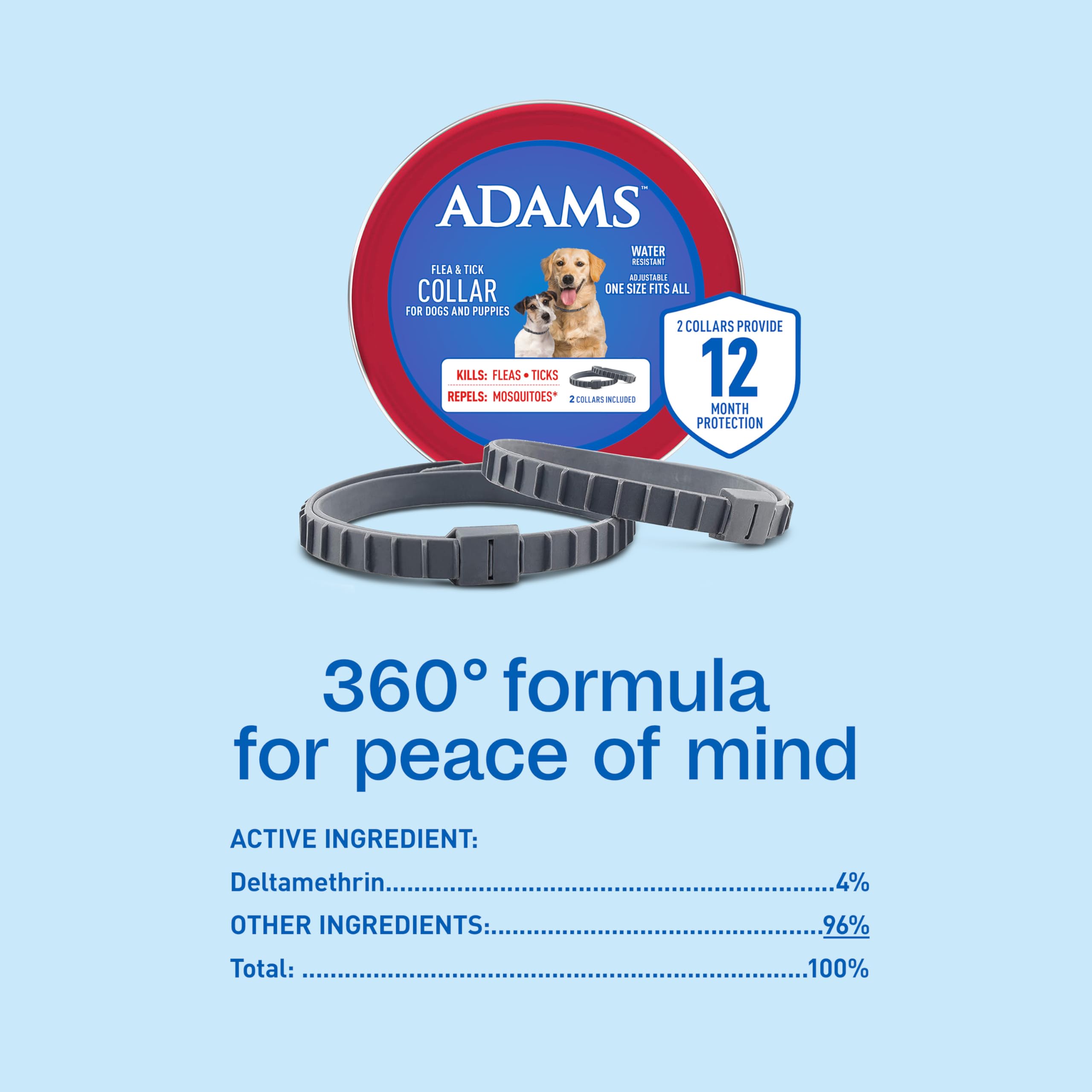 Keep your dog protected with ADAMS Flea and Tick Collar, the water-resistant flea collar that provides pest defense. Our innovative extended-release technology continuously delivers the active ingredient to your dog’s coat and skin, targeting fleas, ticks, and mosquitoes. The adjustable collar easily fits over your dog’s existing collar and is simple to use – just place around your dog’s neck, buckle and adjust for comfort, cut off excess (about two inches from buckle), and ensure a loose fit (two fingers should fit between collar and neck). For complete peace of mind all season long, this 2-pack of collars provides up to 12 months of continuous, long-lasting flea and tick protection. The best protection you can offer your pet is protecting them and the areas where they live and play. Since only 5% of fleas live on your pet, use this collar with other ADAMS products to protect your pet, home, and yard for complete pest control. Since 1975, the people who bring you ADAMS have helped owners confidently care for their pets, ensuring they live happy and healthy lives.